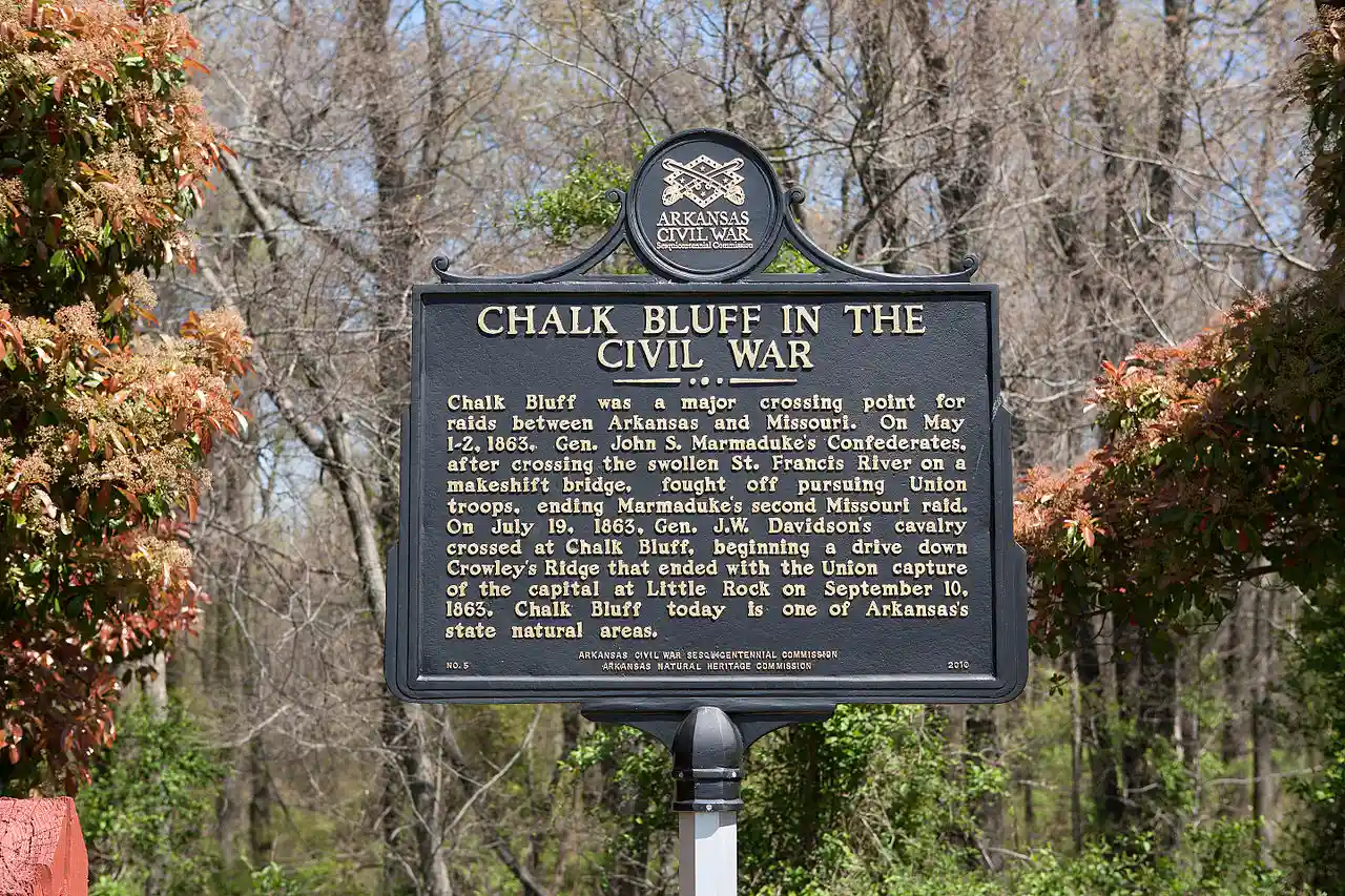 Chalk Bluff was an unincorporated community in Clay County, Arkansas, United States, approximately two miles (3 km) northwest of St. Francis. The town was formed in the 1820s at the point where the St. Francis River cuts through Crowley's Ridge from west to east. The name of the community was derived from the white clay bluff created by this crossing. The founder of the community was Abraham Seitz, who established and operated a ferry crossing and general store in the area from the 1830 until it was destroyed during the Civil War. The community occupied a strategic location and was often referred to in the reports of Union and Confederate forces vying for control of Northeast Arkansas during the war. Several skirmishes occurred near the ferry crossing, one of which was significant it enough to become known as the Battle of Chalk Bluff, which took place in early May 1863.Wright, V.C., & Laud Payne, "The Battle of Chalk Bluff..." Piggott, Arkansas: 1953. The town was abandoned following the Civil War and most residents moved to the new railroad town, St. Francis, Arkansas.Webb, Robert T.; History & Traditions of Clay County. Little Rock, Arkansas: Parke-Harper Co., 1933 (reprinted in the Piggott Times, April 29, 1982.) The location was listed on the National Register of Historic Places in 1974. Read more on Wikipedia