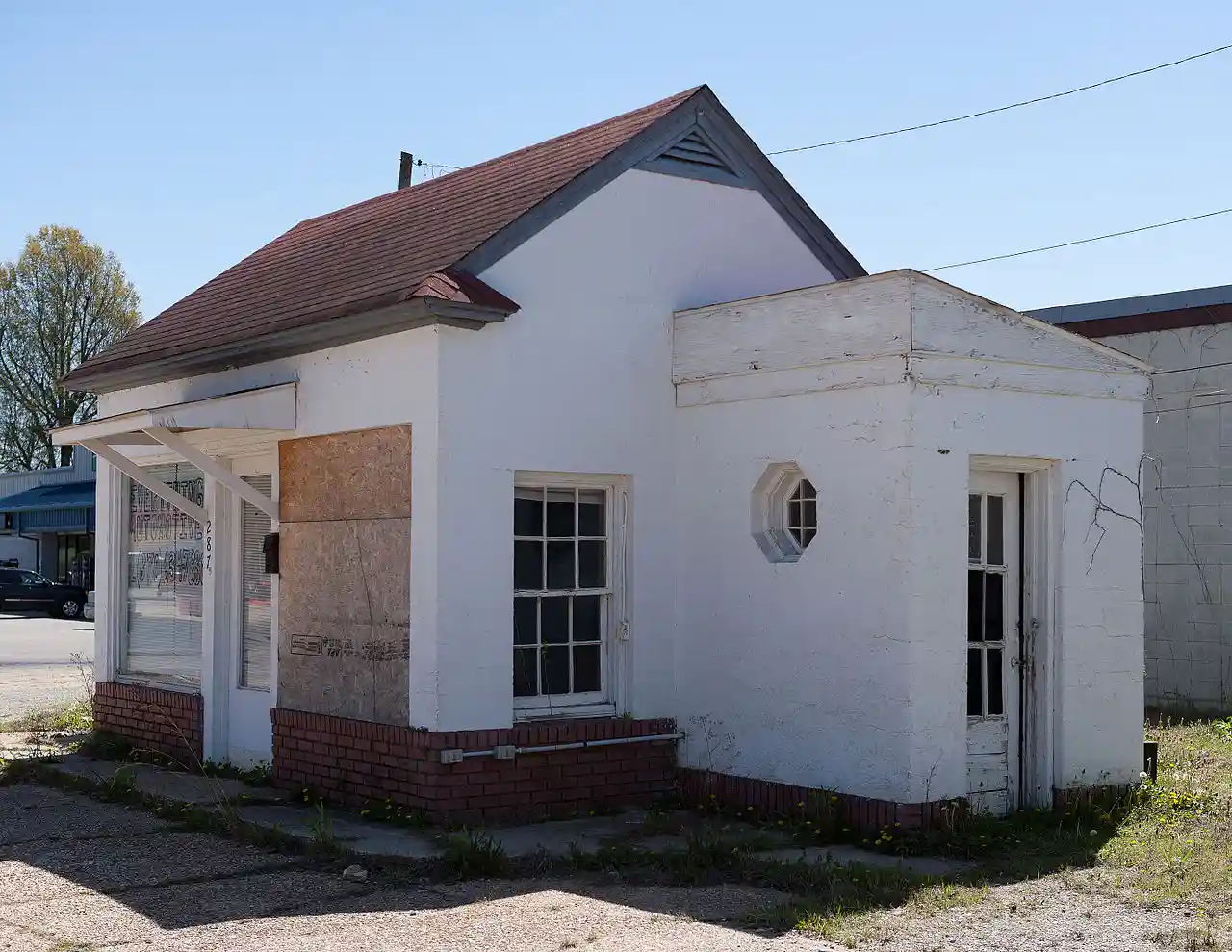 The Esso Station was a historic Esso automotive service station at 287 East Main Street in Piggott, Arkansas. It was a small single-story single-room stuccoed structure, with flanking shed-roofed restroom wings on either side. The main block was fronted by plate glass windows on either side of an entrance sheltered by a small shed-roof portico. It had distinctive Colonial Revival detailing, including a row of soldier bricks at the top of the foundation, and a modillioned cornice. The station was built in 1942. It was demolished sometime after August 2013. Read more on Wikipedia