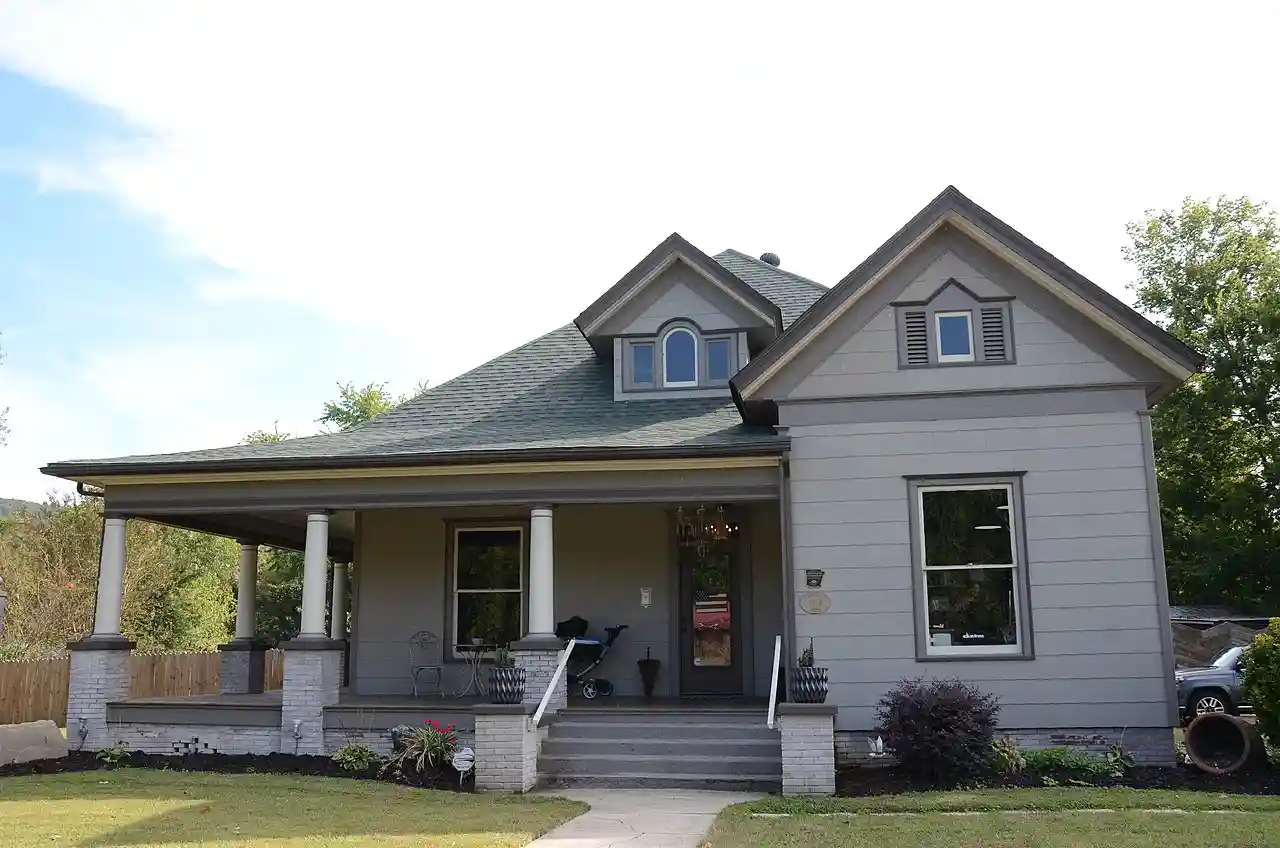 The Rector House is a historic house at 603 West Quitman Street in Heber Springs, Arkansas. It is a roughly rectangular single-story wood-frame structure, with a gable-on-hip roof that is on two sides extended at a lower slope across a wraparound porch. The porch is supported by Tuscan columns set on brick piers. To the right of the main entrance (which is accessed via the porch) is a projecting gabled section, with a small square window in the gable, flanked by vents and topped by a mini-gable. The house was built in 1915–16, and is considered a good example of the "Free Classic" form of Queen Anne architecture. Read more on Wikipedia