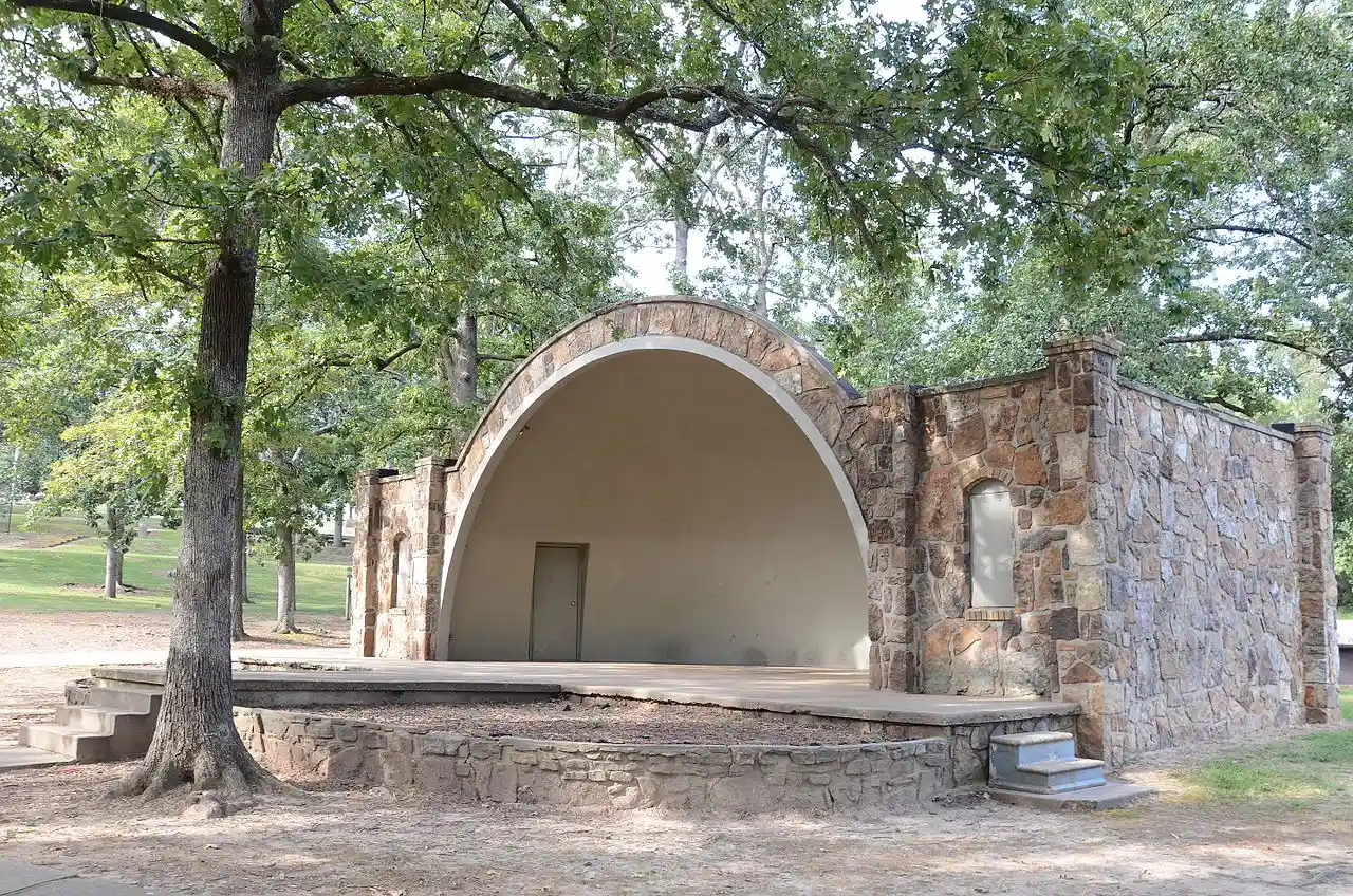 The Woman's Community Club Band Shell is a historic open-air band shell in Spring Park, a public park in downtown Heber Springs, Arkansas. It is a roughly rectangular structure, built out of local fieldstone, with the main half-dome shell formed out of concrete. The sides of the shell are articulated by pilasters, which also appear at the building corners. The rear of the building is enclosed, provide dressing room space for performers. The shell was built in 1933, replacing an older wood-frame performance pavilion. Read more on Wikipedia