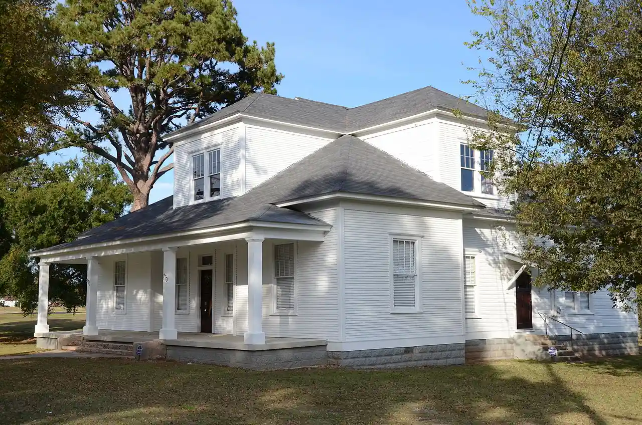 The Bryant-Lasater House is a historic house at 770 North Main Street in Mulberry, Arkansas. It is a -story wood-frame structure, set on a foundation of molded concrete blocks, with a shallow-pitch pyramidal roof (pierced on each side by a hip-roof dormer), and a hip-roof porch extending across the front. A rear porch has been enclosed. Built c. 1900, the house is locally distinctive for its architecture, as a particularly large example of a pyramid-roofed house, and for its historical role as the home of a succession of locally prominent doctors, including Dr. O. J. Kirksey, who operated a maternity hospital in the house. Read more on Wikipedia