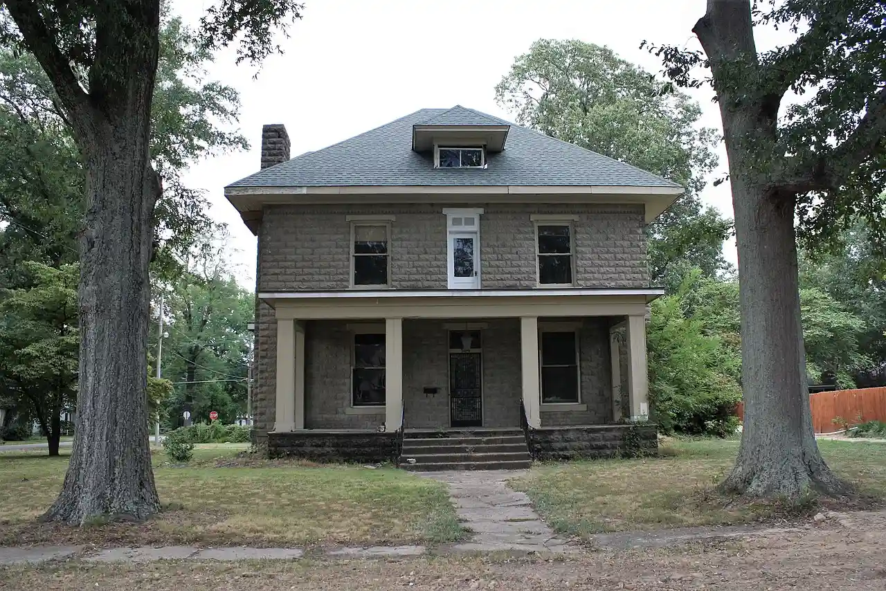 The Servetus W. Ogan House is a historic house at 504 East Forrest Avenue in Wynne, Arkansas. It is a two-story American Foursquare building, built out of rusticated concrete blocks in 1910. It has a hip roof with hipped dormers, and a projecting single-story porch supported by square columns. It is one of the city's few examples of residential concrete-block construction, a style that was briefly popular in the area. Read more on Wikipedia