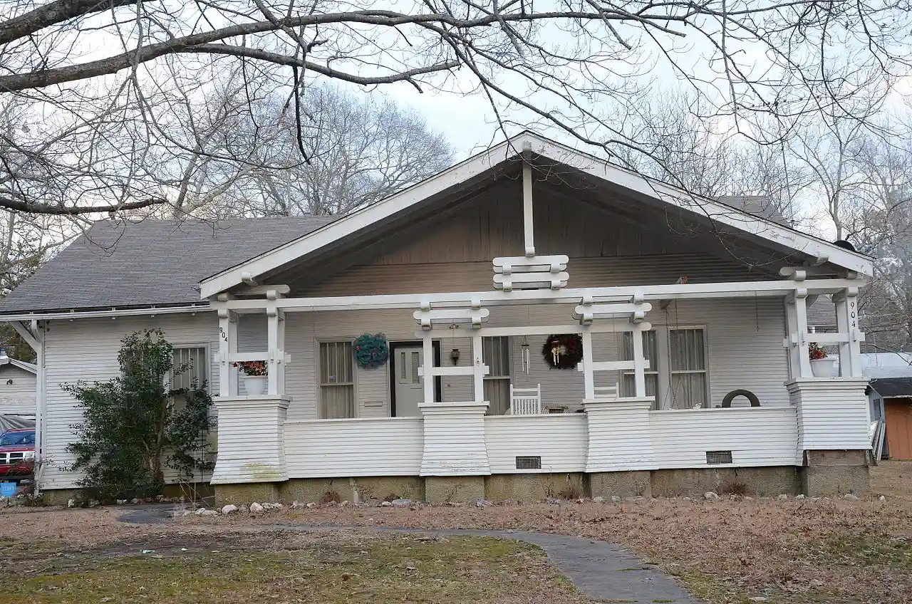The John Russell House is a historic house at 904 Charlotte Street in Fordyce, Arkansas. This single-story wood-frame house was built c. 1925, and is Dallas County's finest example of Craftsman architecture. It has an outstanding porch whose roof is supported by four columns of geometrically arranged wooden members. A horizontal tie beam between the inner columns supports a column up to the apex of the gable roof. Read more on Wikipedia