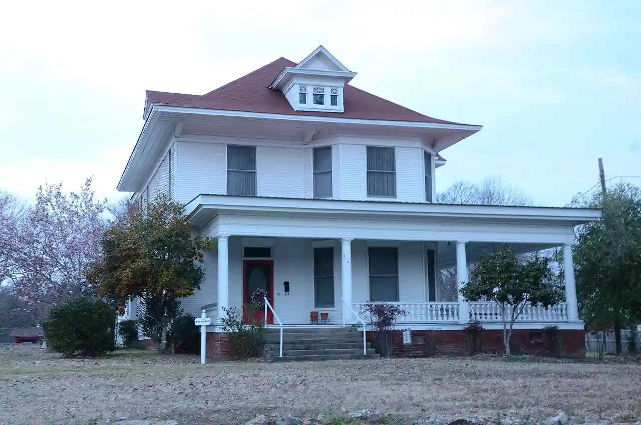 The Waters House is a historic house at 515 Oak Street in Fordyce, Arkansas. The -story Foursquare house was designed by Charles L. Thompson and built in 1907, and is one of the finest Colonial Revival houses in the city. It has a hipped roof with flared eaves, and cross gables on the sides. The main facade features a projecting bay that rises the full two stories, and is topped by a gable with dentil molding and flared eaves. A single-story porch wraps around two sides of the house. Read more on Wikipedia