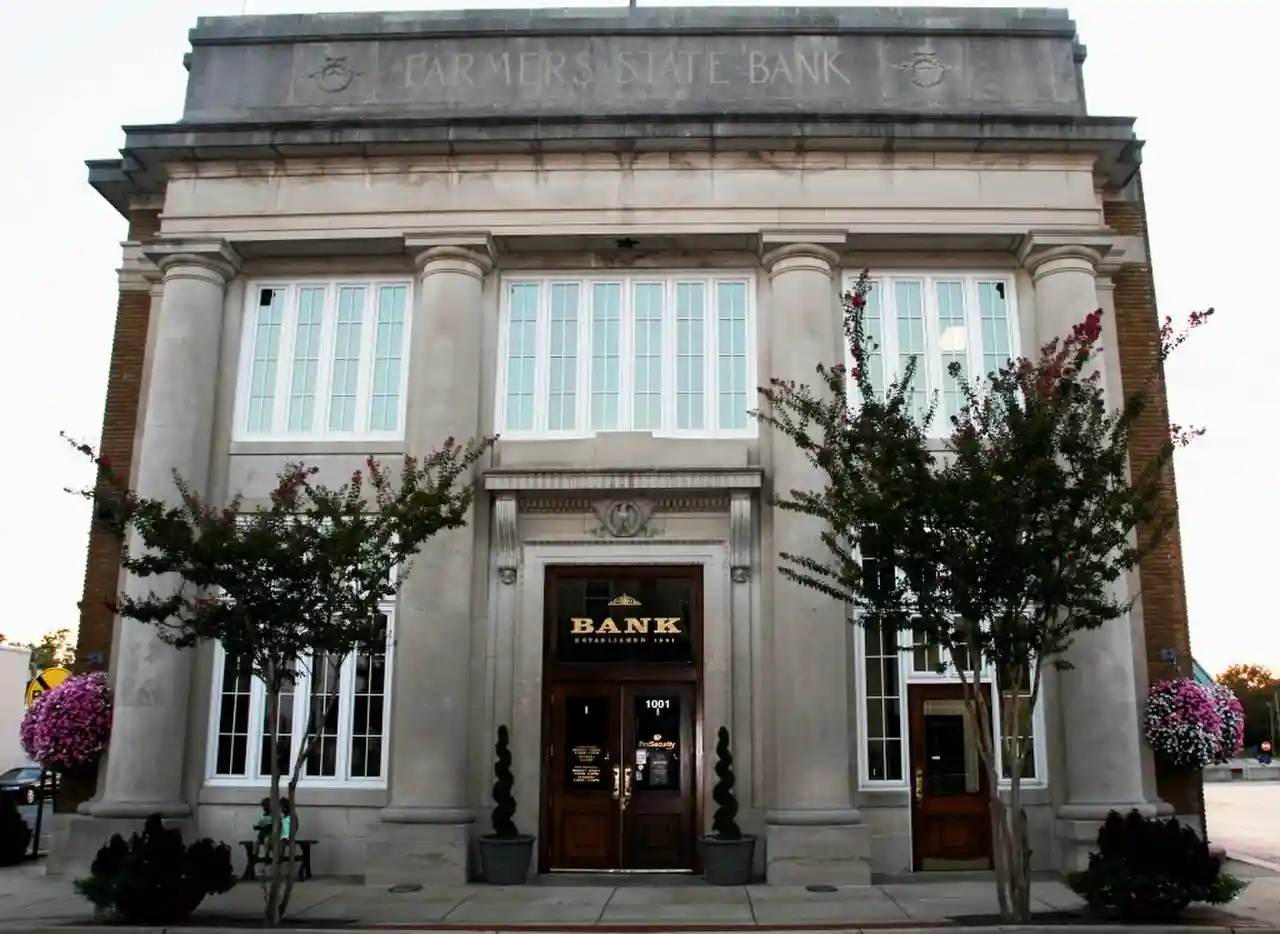 The Farmers State Bank is a historic commercial building at 1001 Front Street in Conway, Arkansas. It is a two-story masonry structure in the Classical Revival style. Its side walls are finished in brick, and most of its facade is in stone. The dominant feature of the facade are four massive engaged Tuscan columns, which support an entablature, cornice, and parapet. The main entrance is set in the central bay, with a bracketed hood above. It was designed by Thompson & Harding and built about 1918. Read more on Wikipedia