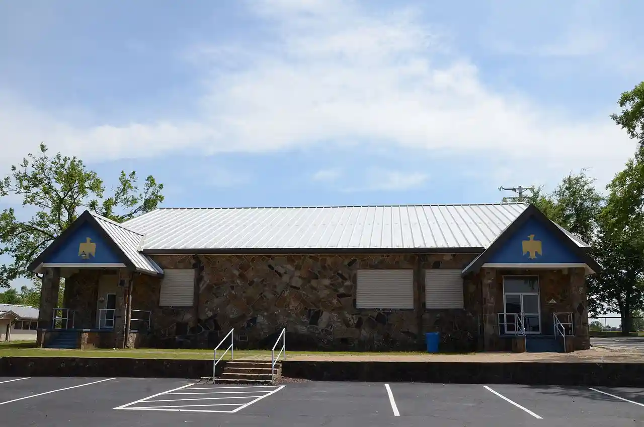 The Guy High School Gymnasium is a historic school building on the campus of the Guy-Perkins District School System on Arkansas Highway 25, just east of Guy, Arkansas. It is a single story stone structure, with a gabled rood and four brick chimneys. Two gabled porches project from the front side, near the corners, each supported by stone columns and featuring stuccoed pediments. It was built by local labor with funding support from the Works Progress Administration in 1938. Read more on Wikipedia