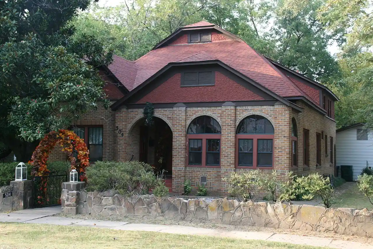 The Michael M. Hiegel House is a historic house at 504 Second Street in Conway, Arkansas. It is a picturesque -story structure, finished in brick and stucco and covered by a gable-on-hip roof. The main facade bays are articulated by brick pilasters, with the two right bays filled with round-arch windows, and the bay to their left housing the main entrance, deeply recessed under a similar rounded arch. To its left is a projecting gable-arched section with a pair of sash windows. Built about 1911, it is a high quality local example of Tudor Revival architecture. It was built by Michael Hiegel, a prominent local businessman who operated a grocery store and lumber business, and was active in local political affairs. Read more on Wikipedia