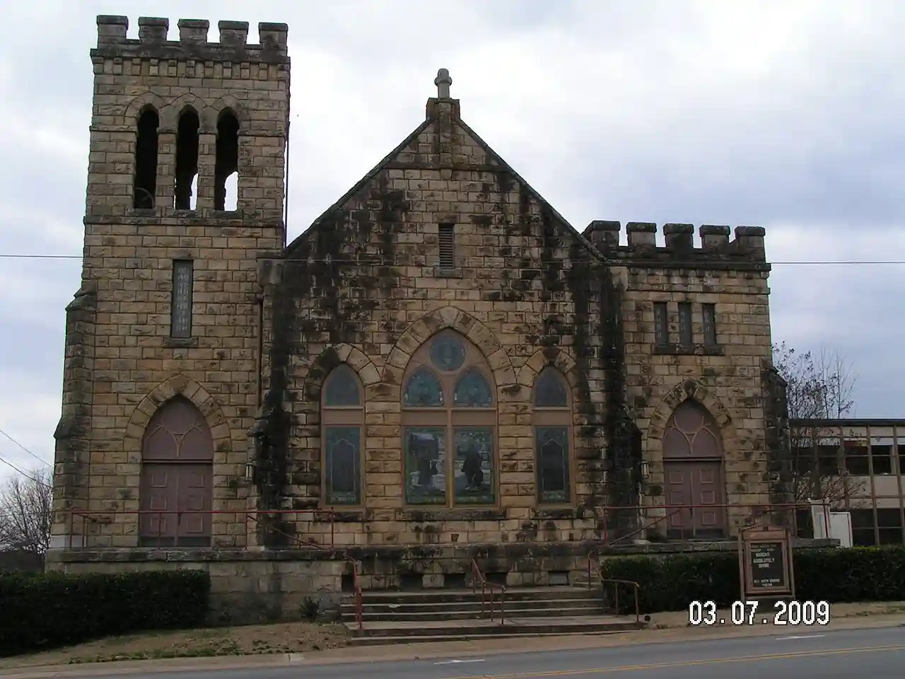 First Methodist Episcopal Church, South is a historic church at 503 West Commercial Street in Ozark, Arkansas. It is a -story stone structure, with a steeply pitched gable roof and a pair of square stone towers flanking the front-facing gable end. The taller left side tower has belfry stage with grouped round-arch openings on each side, and both towers have crenellated tops. The church was built in 1909 for a congregation organized in 1871. The architect was Alonzo Klingensmith of Fort Smith. Read more on Wikipedia