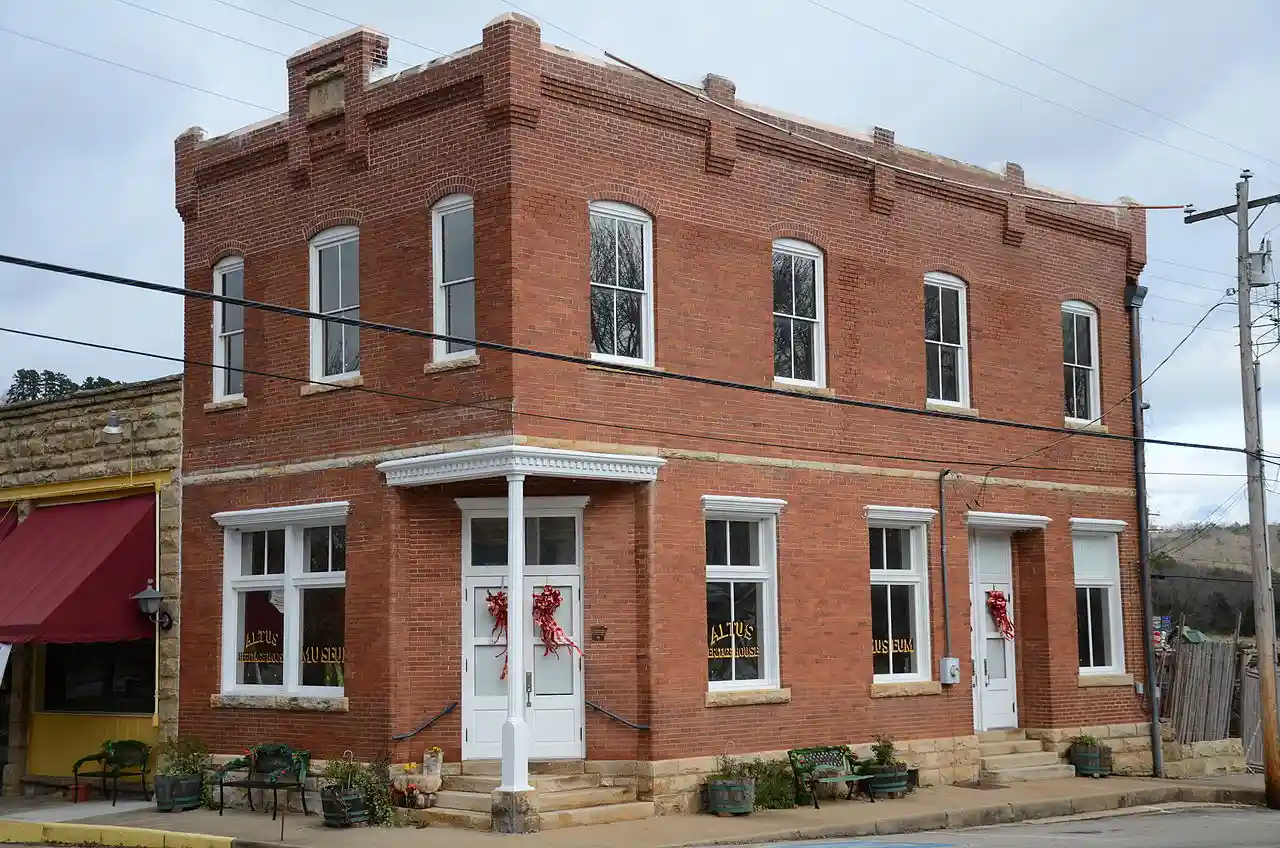 The German-American Bank is a historic commercial building at Franklin and Main Streets in Altus, Arkansas. It is a two-story masonry structure, built out of red brick with a stone foundation and trim. It has an angled store entrance at the corner, sheltered by an overhang with a dentillated cornice and supported by a round column. Windows on the second level are set in segmented-arch openings, and the flat roof is obscured by a raised brick parapet. Built in 1905, it is Altus' finest example of commercial Italianate architecture. Read more on Wikipedia