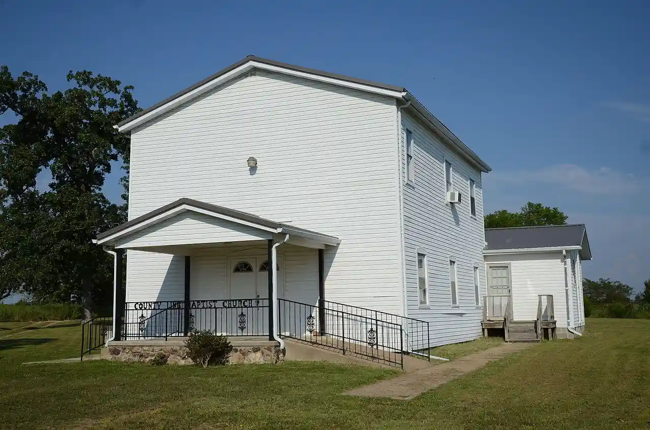 The County Line School and Lodge is a historic multifunction community building in rural western Fulton County, Arkansas. It stands at the junction of County Roads 115 and 236, just east of the county line with Baxter County, west of the small community of Gepp. It is a vernacular two story wood-frame structure with a gable roof and a cast stone foundation. The ground floor houses a school room, and the upper floor was used for meetings of the County Line Masonic Lodge. It was built c. 1879, and was one of the first community buildings to be built in the area. Intended to actually stand astride the county line (since it served communities in both counties), a later survey determined it lies a few feet within Fulton County. The building was used as a school until 1948, when the local school systems were consolidated. Read more on Wikipedia