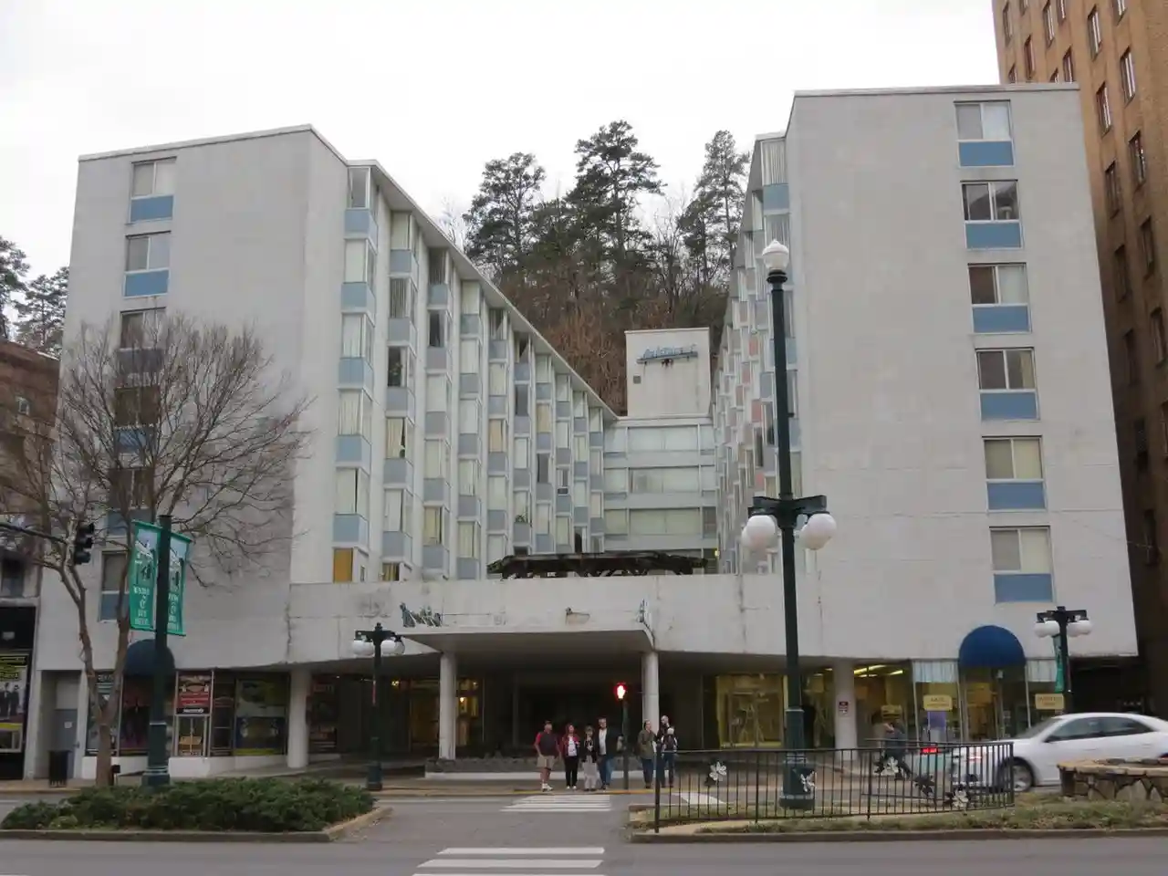 The Aristocrat Motor Inn is a historic hotel building at 240 Central Avenue in Hot Springs, Arkansas. It is a large seven-story structure, with a six-story U-shaped tower set on a basically rectangular ground floor. It is finished in glass, brick, and metal, in the Mid-Century Modern style. The tower is organized around a central courtyard, with the interior facades in a sawtooth pattern to maximize light coming into the hotel rooms facing inward. The hotel was built in 1963 by Samuel Kirsch, a local businessman engaged in a variety of pursuits. It was one of the first hotels built along the city's Central Avenue to feature a Modernist exterior. It was operated as a hotel until 1978, and was after converted into low-income housing. Read more on Wikipedia