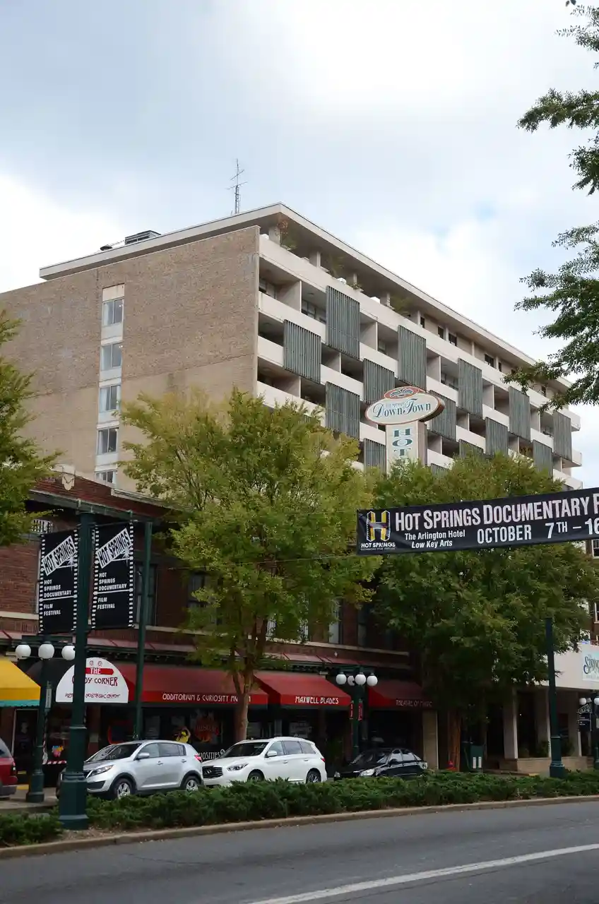 The Hill Wheatley Downtowner Motor Inn is a historic hotel at 135 Central Avenue in Hot Springs, Arkansas. It is a ten-story rectangular structure, finished in glass, brick, and metal, in the Mid-Century Modern style. Its main block is set back from the street, behind a two-story entry retail section. The tower is fronted mainly by balconies with panels of redwood screening to provide visual relief and shade. The hotel was designed in 1965 by Noland Blass Jr. for Hill Wheatley, one of Hot Springs' major promoters. It is one of the only surviving hotels in the city with its own bathhouse. Read more on Wikipedia