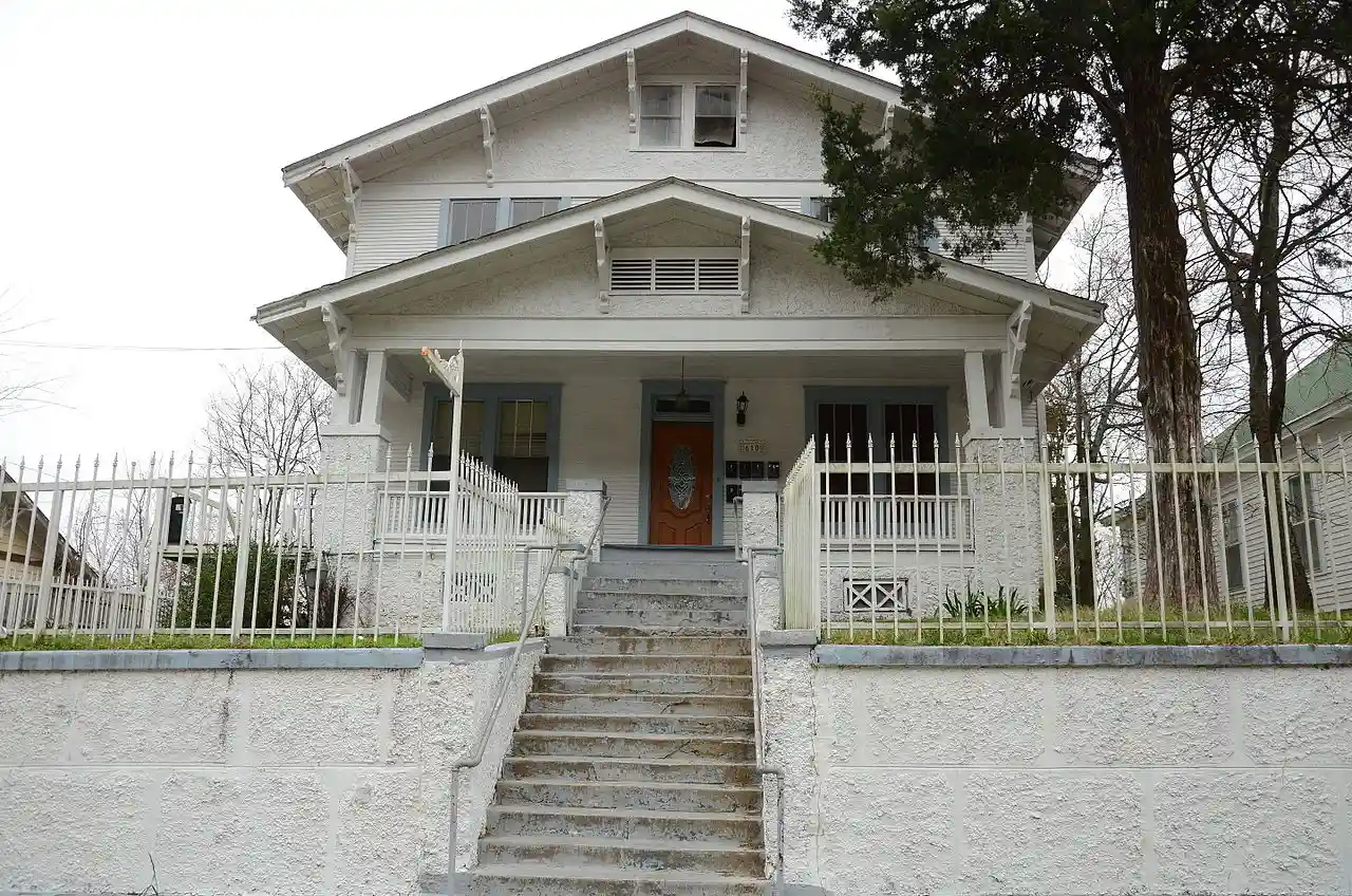 The Plaza Apartments are a historic residential building at 610 Spring Street in Hot Springs, Arkansas. It is a two-story wood-frame structure, with a front-facing gable roof, stuccoed exterior, and a single-story gabled front porch. The stucco has been painted to resemble stone blocks. The roof eaves are decorated with large Craftsman style brackets. The building was constructed about 1915 as a rooming house, and is a good local example of Craftsman styling. The building's interior has also retained significant period woodwork, including trim, doors, and stairs. Read more on Wikipedia