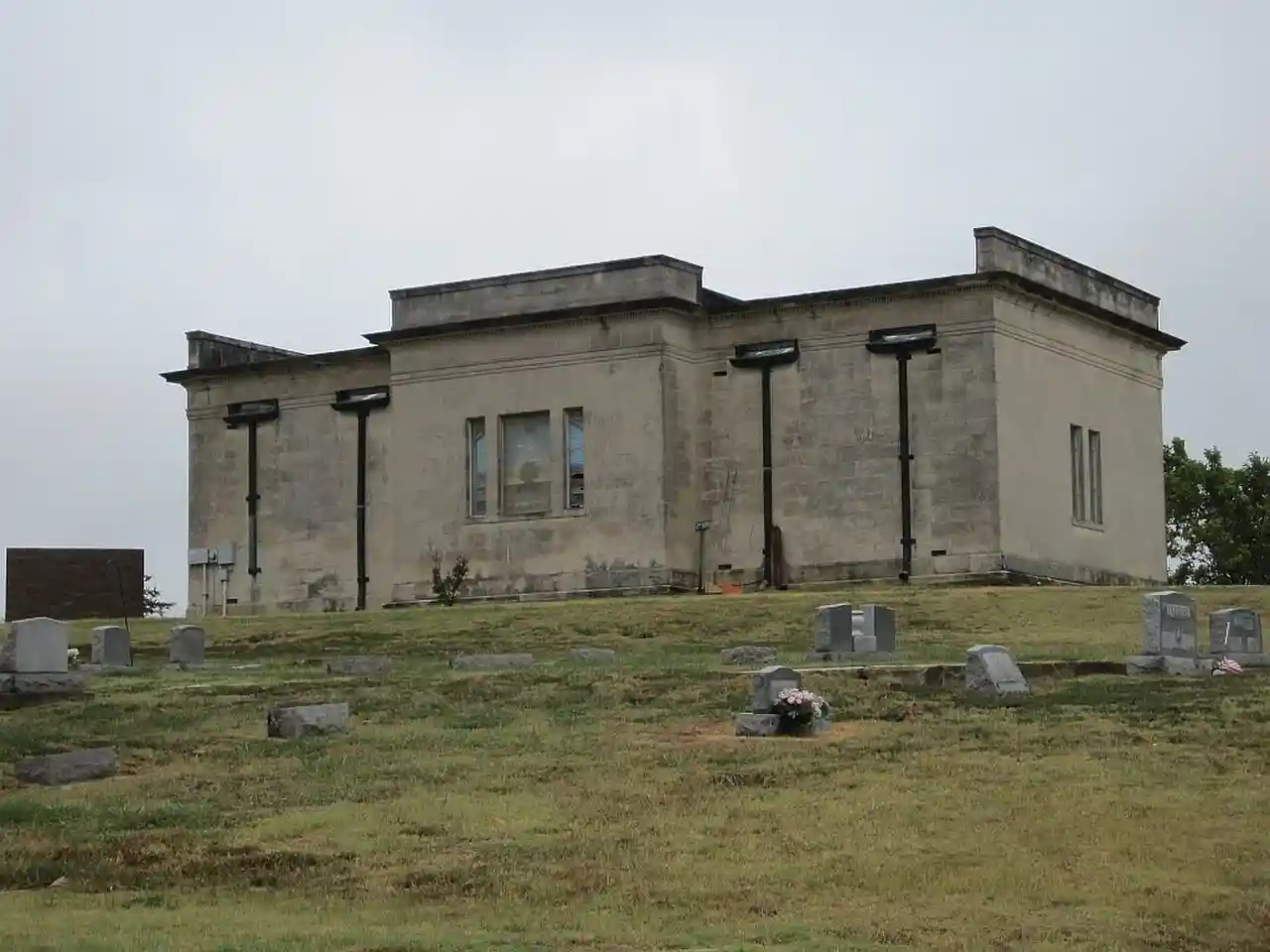 The Linwood Mausoleum is a massive limestone structure in Linwood Cemetery, Paragould, Arkansas. Occupying the highest ground in the cemetery, it is a rectangular single-story Classical Revival limestone structure, with stained-glass windows. Its interior walls are finished with gray-veined white marble. The entry is sheltered by a portico with Doric columns. The mausoleum houses 170 crypts. Built in 1920 by a group of private citizens, it was later conveyed to the city, and is (as of 2007) Arkansas' only known city-owned mausoleum. It is also architecturally distinctive in the region for its heavy limestone construction and Classical Revival features. Read more on Wikipedia