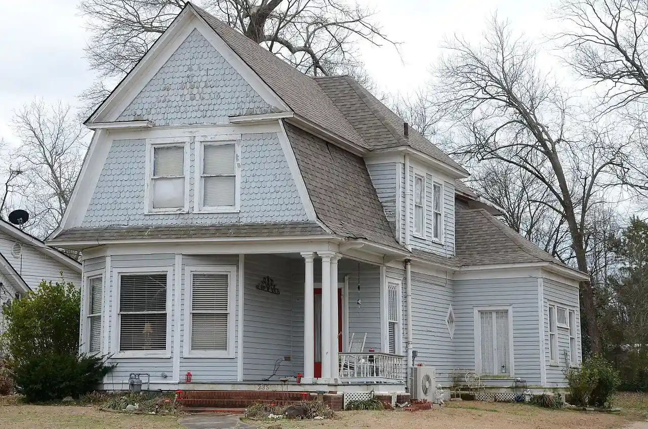 The Gatewood House is a historic house at 235 Pine Bluff Street in Malvern, Arkansas. It is a two-story wood-frame structure, roughly rectangular in plan, with a gambrel roof and weatherboard exterior. The gambrel roof is unusual in that the upper level slightly overhangs the steeper lower parts. The front-facing gable rests above a polygonal bay window on the left and a recessed porch on the right, which is supported by clustered Tuscan columns. Built in 1905, the building represents a well-executed example of a vernacular interpretation of the Shingle style of architecture. Read more on Wikipedia