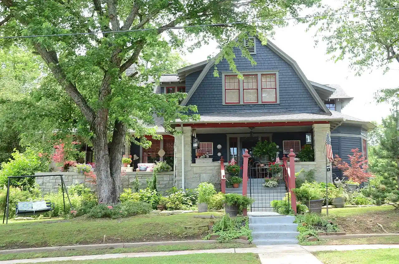 The Mitchell House is a historic house at 1183 Main Street in Batesville, Arkansas. It is a two-story wood-frame structure, with weatherboard siding, and a cross-gable roof configuration. The front facade is dominated by a gambreled gable projecting over the front porch, which is fashioned out of locally sourced limestone, including the facing on the supporting piers. The house was built in 1917 to a design by Arkansas architect Charles L. Thompson. Read more on Wikipedia