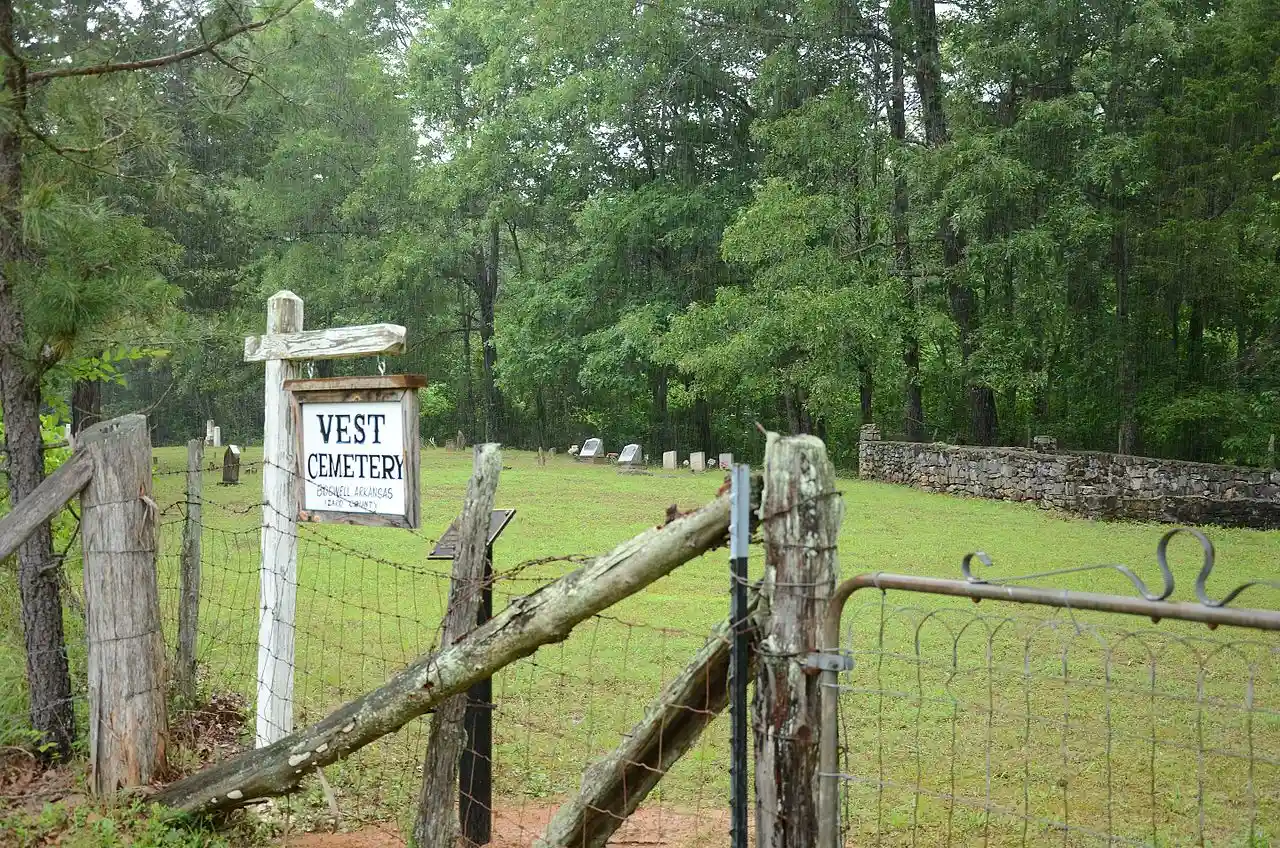 The Vest Cemetery is a historic cemetery in rural western Izard County, Arkansas. It is located at the end of Vest Cemetery Road (County Road 197), north of the hamlet of Boswell, adjacent to the site of the former Vest family homestead. It is a rectangular parcel, with 72 known graves dating back to the early settlement period of Boswell in the 1870s. A portion of the cemetery is lined by a low rock wall, built to keep cattle from grazing on the family graves of the Cockersham family. The entire cemetery is now lined by woven wire fencing. Read more on Wikipedia