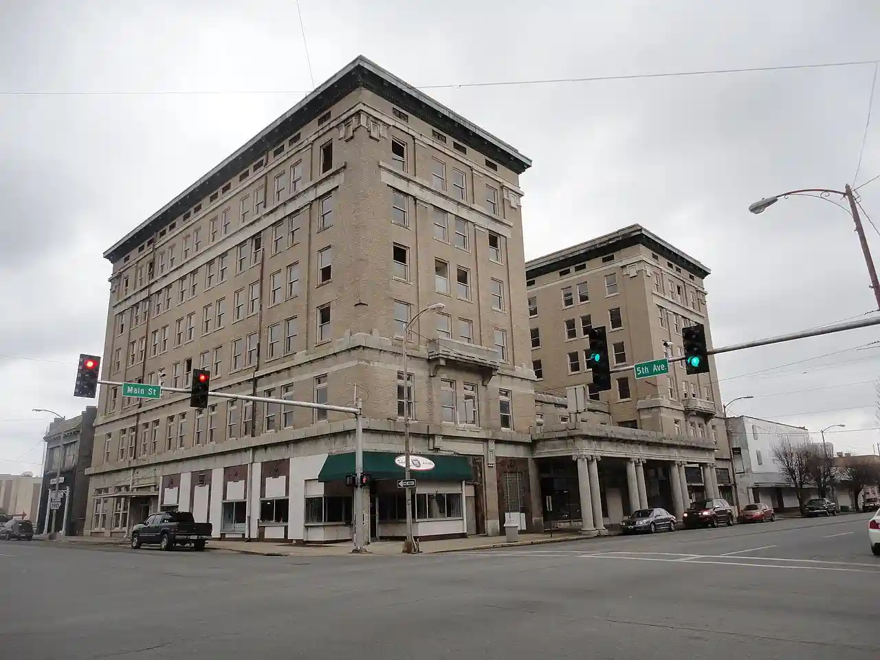 The Hotel Pines is a historic commercial building at the northwest corner of West 5th and Main Streets in Pine Bluff, Arkansas. It is a large six-story U-shaped masonry structure, with a two-story section filling the center of the U. The center section has a portico projecting over the sidewalk, with Classical Revival detailing and paired columns for support. Built in 1913 and in operation as a hotel until 1970, it was Pine Bluff's grandest hotel. Read more on Wikipedia