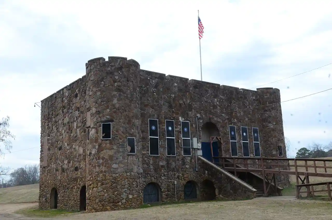 The Bunch-Walton Post No. 22 American Legion Hut is a historic social club meeting hall at 201 Legion Street in Clarksville, Arkansas. It is architecturally unique in the community, built out of native stone in the manner of a Norman castle. It is two stories in height, with rounded projecting corners and a crenellated parapet. Its main entrance is set in a rounded-arch opening at the center of the front facade, and is elevated, with access via flight of stairs. It was built in 1934, and is believed to be the only American Legion hall of this style in the state. Read more on Wikipedia
