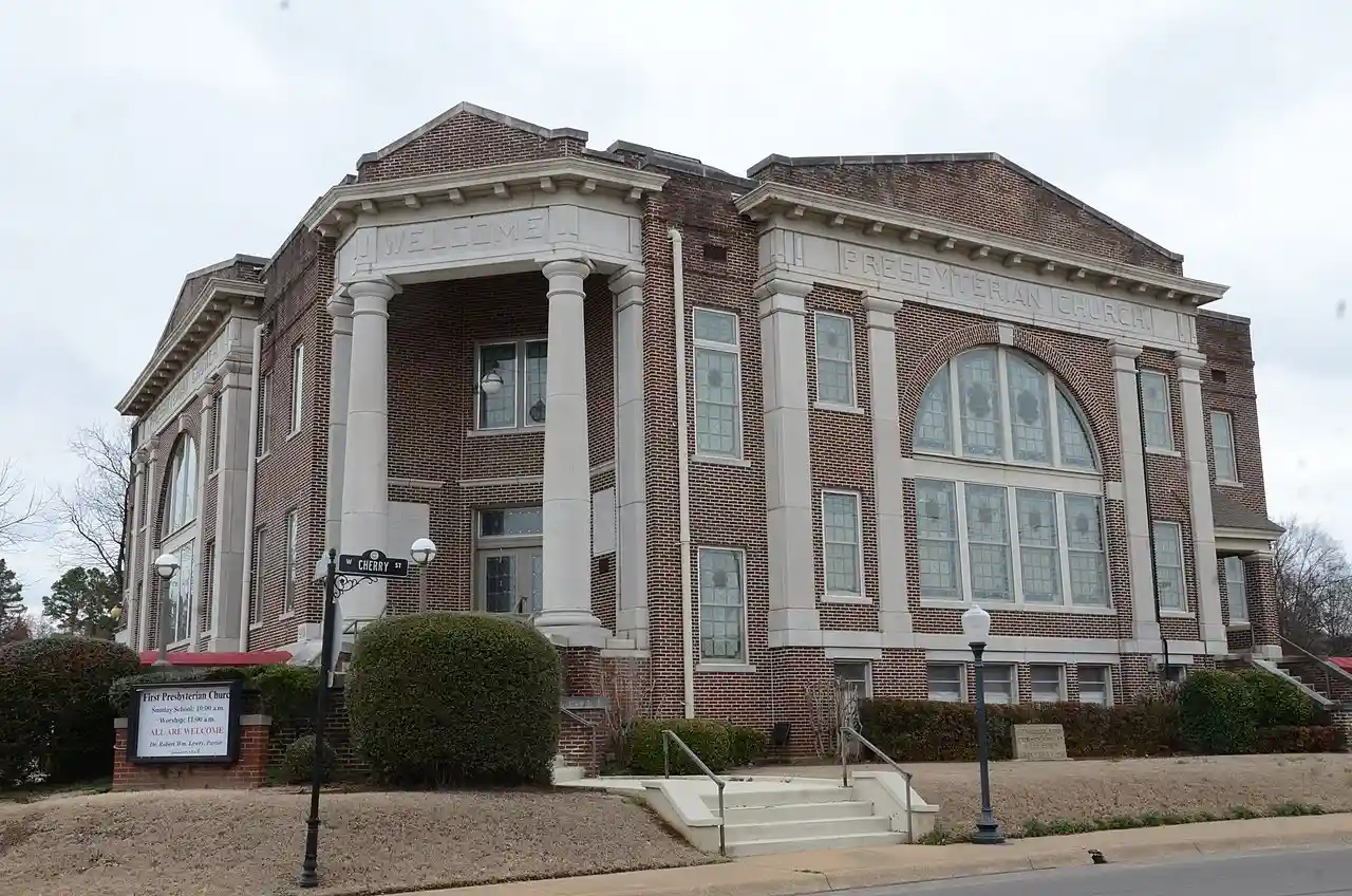 The First Presbyterian Church is a historic church building at 212 College Avenue in Clarksville, Arkansas. It is a two-story steel-framed structure, finished in brick. It is rectangular, with a central sanctuary flanked on the sides by office and meeting spaces. At the center of its roof is a dome, which is obscured by gabled parapets on the street-facing facades. The church was designed by Rogers based architect A.O. Clarke, and was completed in 1922 for a congregation founded in 1840. It is the finest example of Classical Revival architecture in Johnson County. Read more on Wikipedia