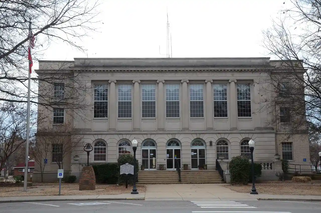 The Johnson County Courthouse is located at 215 W. Main Street in downtown Clarksville, the county seat of Johnson County, Arkansas. It is a three-story masonry structure, built out of brick and rusticated concrete blocks. It has a Classical Revival facade, with a seven-bay projecting section. Windows and entrances on the ground floor are set in round-arch openings, while the upper-level windows are rectangular sash, set in bays articulated by pilasters. It was built in 1934 with funding support from the Federal Emergency Administration, and is the county's third courthouse. Read more on Wikipedia