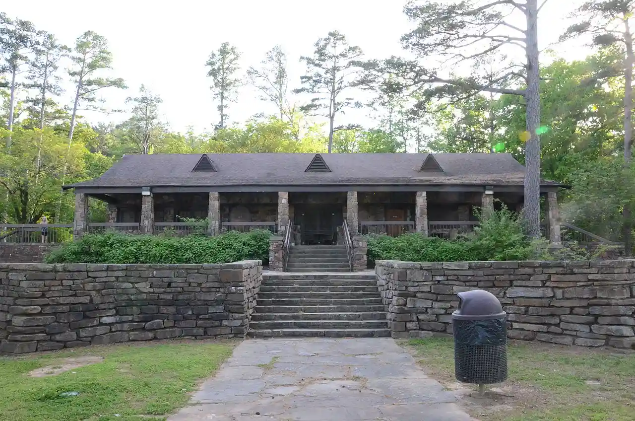 The Cove Lake Bathhouse is a historic recreational facility at the Cove Lake Recreation Area, north of Corley, Arkansas in the Ozark-St. Francis National Forest. It is a T-shaped stone structure, built of fieldstone with a gabled roof. A porch extends across the front, supported by stone piers. The roof is pierced by three triangular dormers with vents in them. It was built in 1937 with funding from the Works Progress Administration, and represents a distinctive departure from the more typical Rustic architecture produced by WPA projects. Read more on Wikipedia