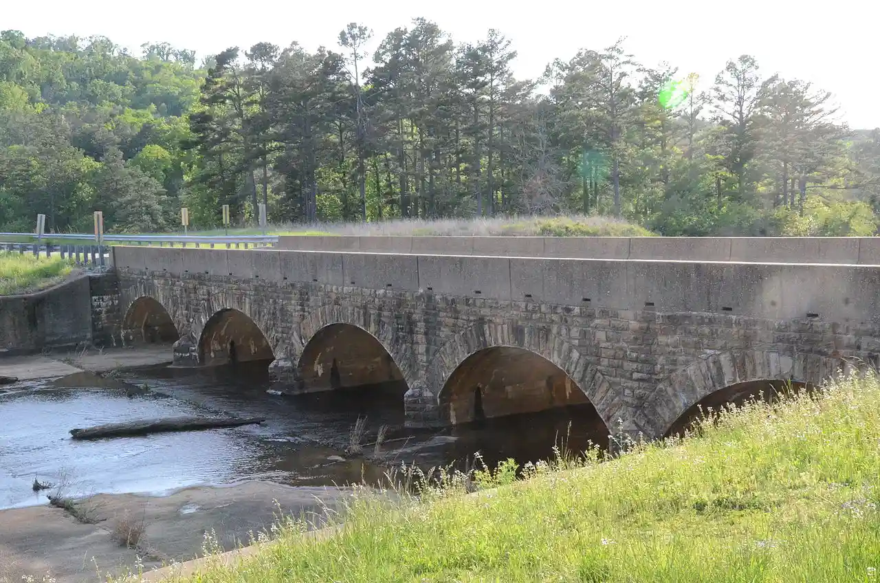 The Cove Lake Spillway Dam and Bridge are historic structures in Ozark-St. Francis National Forest, north of Corley, Arkansas. The dam is built of earth and stone, and impounds Cove Lake, location of a recreation area in the national forest. The bridge is a five-span masonry arch structure, built across the dam spillway, where it carries Arkansas Highway 309. The dam and bridge were built in 1937 with funding from the Works Progress Administration, and is a fine example of the Rustic architecture WPA projects were known for. Read more on Wikipedia