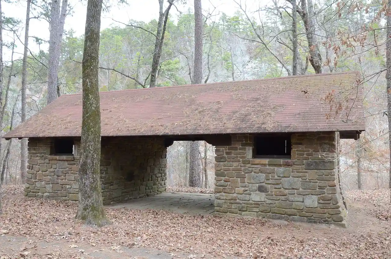 The Jack Creek Bathhouse is a historic recreational facility in Ouachita National Forest, Logan County, Arkansas. It is located south of Booneville, at the Jack Creek Recreation Area in the northern part of the national forest. It is a single-story masonry structure, built out of rustic stone, with a gabled roof supported by logs. It has two dressing rooms, separated by an open breezeway. It was built in 1936 by a crew of the Civilian Conservation Corps, and is a well-preserved example of the Rustic architecture the CCC is well known for producing. Read more on Wikipedia