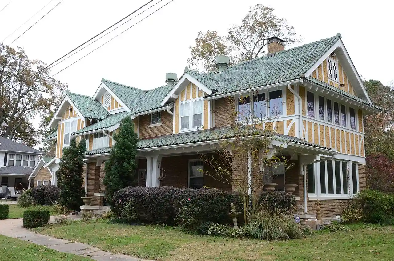 The Eagle House is a historic house at 217 Ash Street in Lonoke, Arkansas. It is a large two story Bungalow/Craftsman style house, with a cross-gable roof configuration, and an exterior of yellow brick and half-timbered stucco. A long single-story porch extends across the front, supported by brick piers and large curved brackets. The house was designed by architect Charles L. Thompson and built in 1915. Read more on Wikipedia