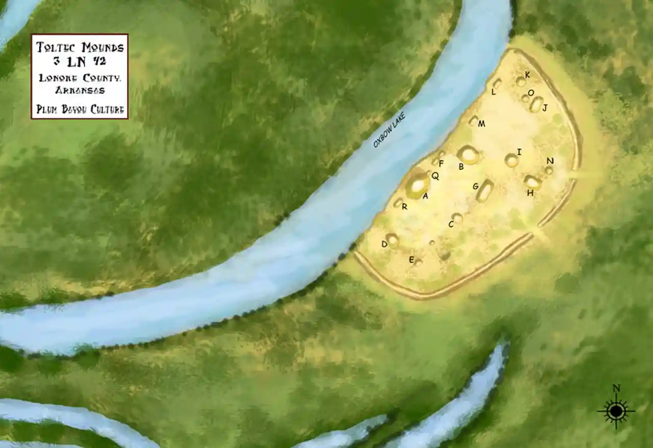 Plum Bayou Mounds Archeological State Park (3 LN 42), formerly known as "Toltec Mounds Archeological State Park", also known as Knapp Mounds, Toltec Mounds or Toltec Mounds site, is an archaeological site from the Late Woodland period in Arkansas that protects an 18-mound complex with the tallest surviving prehistoric mounds in Arkansas. The site is on the banks of Mound Lake, an oxbow lake of the Arkansas River. It was occupied by its original inhabitants from the 7th to the 11th century. The site is designated as a National Historic Landmark. Read more on Wikipedia