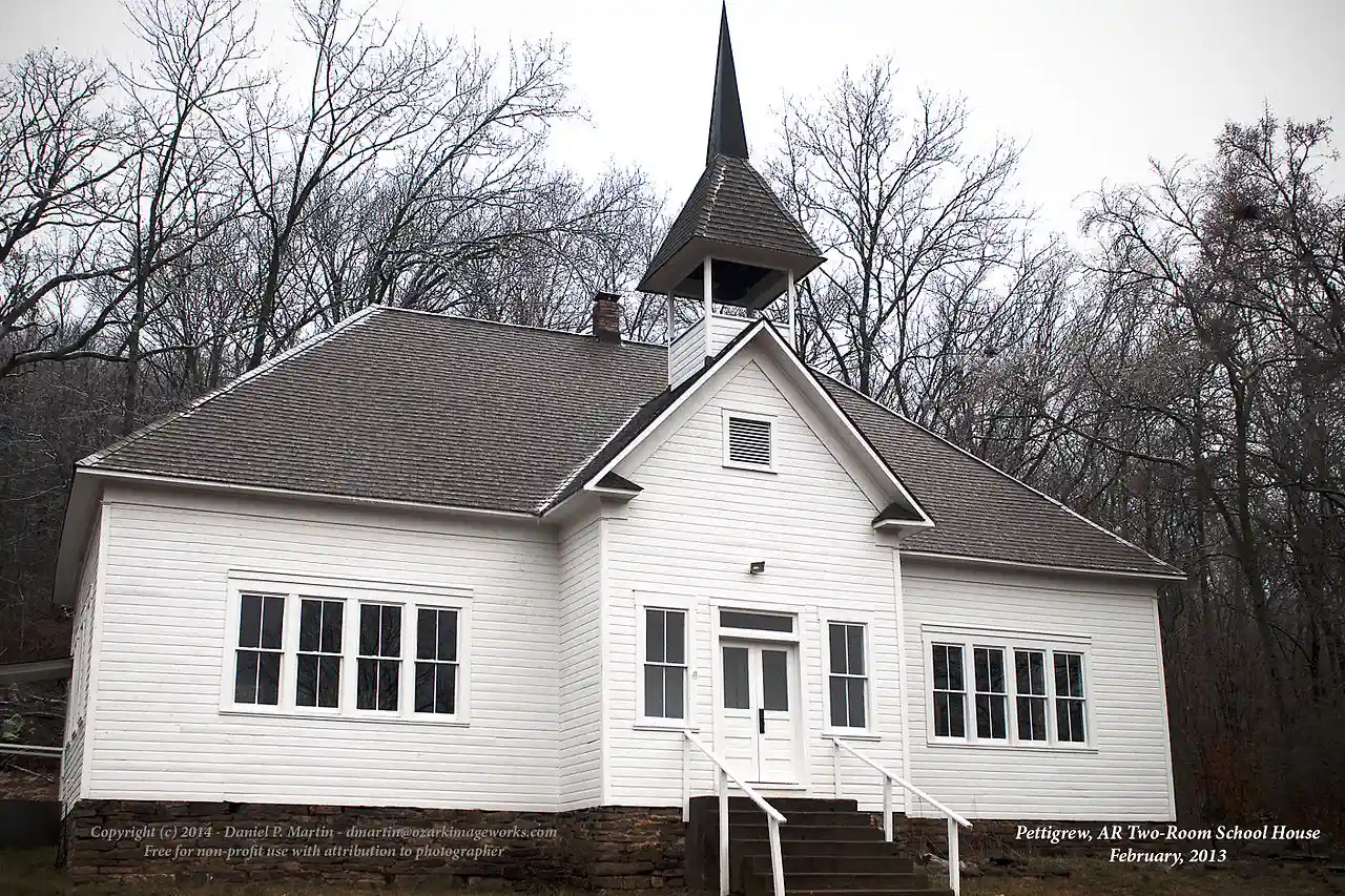 The former Pettigrew School, now the Pettigrew Community Building is a historic school building in the small community of Pettigrew, Arkansas. It is located off County Road 3205, just across the White River from Arkansas Highway 16. It is a single-story wood-frame structure, with a metal hip roof and weatherboard siding. An entry section projects from the center of front facade, topped by a gable roof and small belfry. The building is thought to have been built between 1908 and 1915, and was used as a school until 1963, when the area was consolidated into a larger school district. It has served as a community hall since then. Read more on Wikipedia