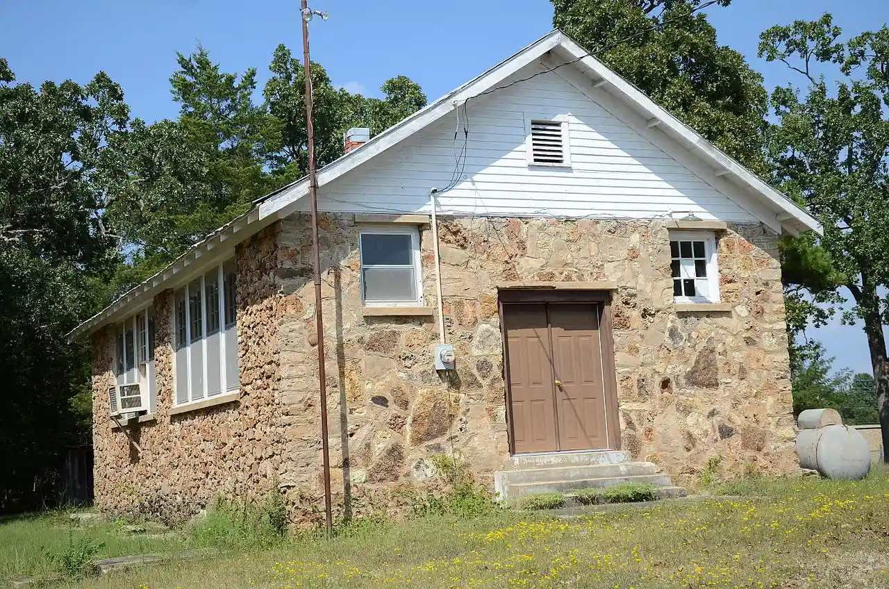 The Fairview School Building is a historic school building in rural Marion County, Arkansas. It is located on the north side of County Road 8064, just west of its junction with Arkansas Highway 178 and the Fairview fire department. It is a single-story stone structure with a gabled tin roof whose eaves have exposed rafter tails in the Craftsman style. Its walls are of both cut and uncut fieldstone, and the foundation is also stone. The main (south-facing) facade is symmetrical, with sash windows flanking a raised double door. The school was built in 1927 by local volunteer labor, despite a downturn in the area's population and economy. () Read more on Wikipedia