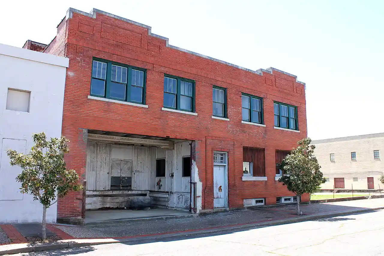 The Swift Building is a historic commercial building at 410 East Broad Street in Texarkana, Arkansas. It is a two-story brick building, with a distinctive brick parapet topped by cast concrete. The main facade has a central doorway, with a series of three sash windows on the right and a recessed loading bay on the left. The building was built c. 1920 by the Swift Meat Company, and is a well-preserved example of a meat packing facility from the period, and a good example of vernacular commercial architecture. Read more on Wikipedia