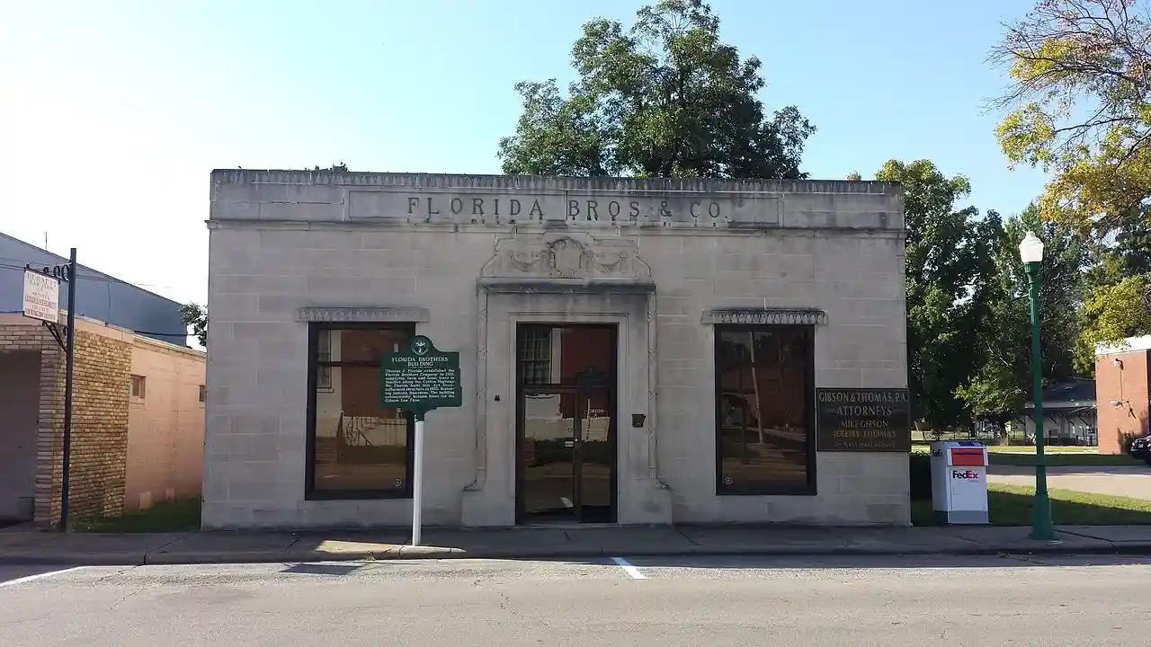 The Florida Brothers Building is a historic commercial building at 319 West Hale Street in Osceola, Arkansas. It is a single-story structure, built of cut stone, with a flat roof. Built in 1936 by Thomas P. Florida to house a real estate business, it is a good example of restrained Art Deco styling. Its main facade has a center entry flanked by plate glass windows, which are topped by stone lintels cut to give the appearance of dentil molding. The entry has a projecting stone outline with reeding, and is topped by a decorative carving. Read more on Wikipedia