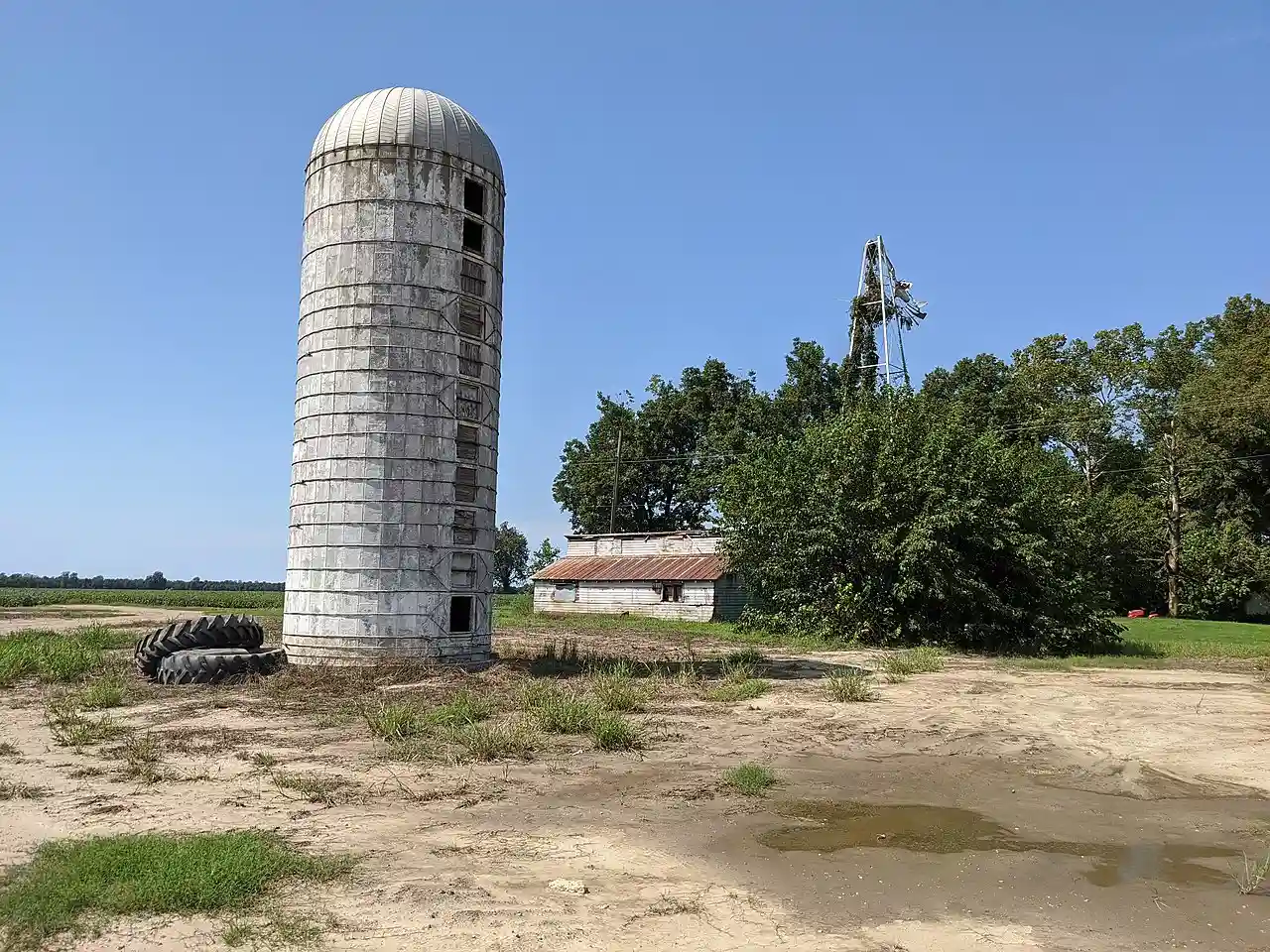 The Edward Samuel Wildy Barn is a historic barn at 1198 South Arkansas Highway 136 in rural Etowah, Arkansas. Built in 1915, it is a well-preserved example of a gambrel-roofed barn in Etowah, representative of agricultural practices of the early 20th century in Mississippi County. It is a rectangular structure, with a central component that is gambrel-roofed, and shed-roofed wings on the sides. The complex it stands in, built in 1915 by Edward Samuel Wildy, also includes from that period a windmill, silo, and concrete pads and troughs. Read more on Wikipedia