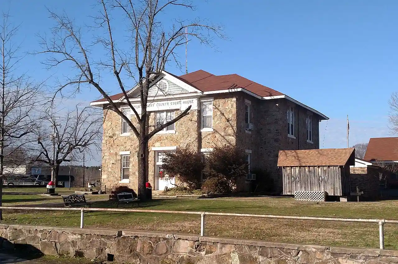 The Montgomery County Courthouse is located at Court Square in the center of Mount Ida, the county seat of Montgomery County, Arkansas. It is a two-story masonry structure, distinctively blending local rustic character with Classical Revival styling. Its walls are fashioned out of randomly laid fieldstone, but features a projecting entry section with a fully pedimented gable with an oriel window at its center. The courthouse was built in 1923 to a design by Clyde A. Ferrel. Read more on Wikipedia