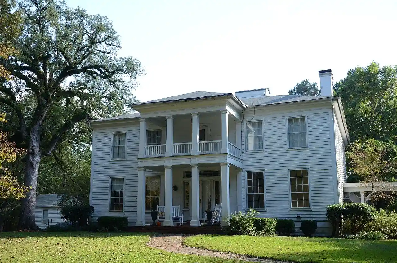 The Bragg House is a historic house in rural Ouachita County, Arkansas. It is a two-story Greek Revival house located about west of Camden, the county seat, on United States Route 278 (formerly designated Arkansas Highway 4). The house is basically rectangular in plan, with a hip roof. Its main entrance is sheltered by a two-story temple-style portico, with four columns topped with Doric capitals, and a turned-baluster railing on the second floor. Peter Newport Bragg began construction of the house in 1842, but did not complete it until 1850. The house was built out of virgin lumber sawn on Bragg's sawmill by his slaves; it remains in the hands of Bragg's descendants. Read more on Wikipedia