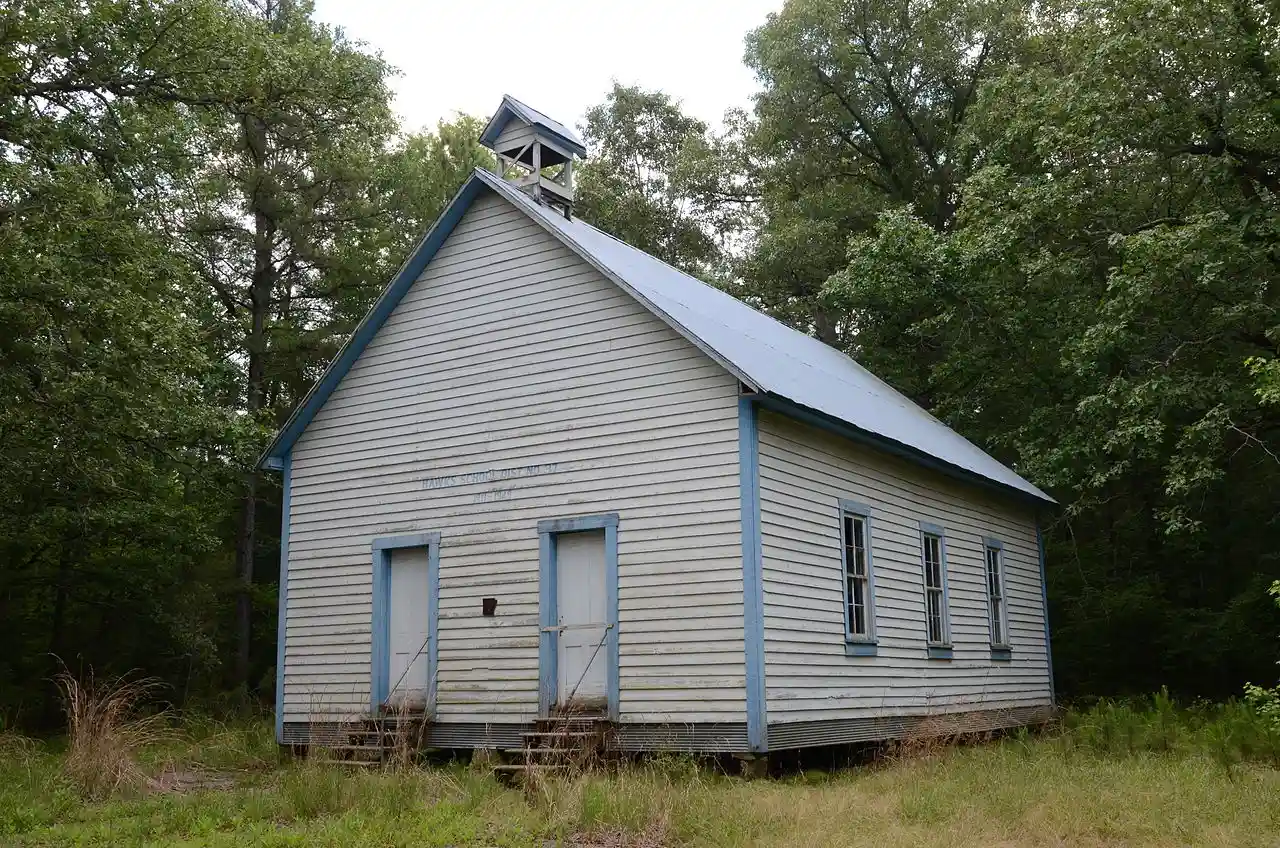 The Hawks Schoolhouse is a historic school building in rural western Perry County, Arkansas. It is located on the south side of County Road 7, in the easternmost section of Ouachita National Forest, near the hamlet of Ava. It is a single-story wood-frame structure, with a gabled roof and weatherboard siding. The roof is capped by a small gable-roofed open belfry. The front facade has a pair of symmetrically placed entrances with simple molding. It was built in 1911, and is a well-preserved example of a district schoolhouse in a rural context. With six photos from 2001. () Read more on Wikipedia