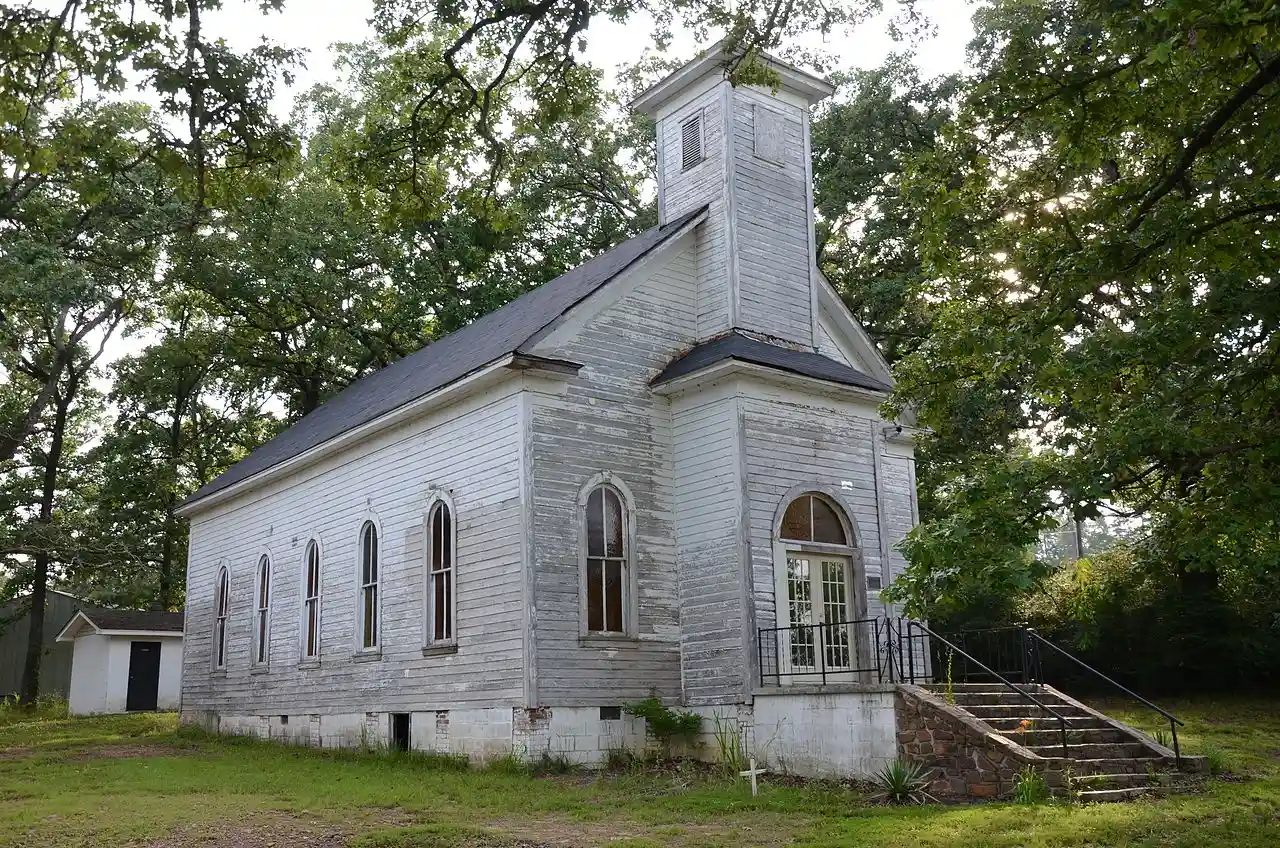 Houston Methodist Episcopal Church, South is a historic church on Arkansas Highway 60, near its junction with Arkansas Highway 216 in Houston, Arkansas. It is a single-story wood-frame structure, with a gabled roof, weatherboard siding, and a foundation of brick and concrete. A hip-roof vestibule projects from the front, with a single-stage square tower above, topped by a pyramidal roof. Doors and windows are set in rounded-arch openings. Built in 1912 for a congregation organized in 1893; it was its second building, it having outgrown the first. It is a fine local example of ecclesiastical Colonial Revival architecture. Read more on Wikipedia