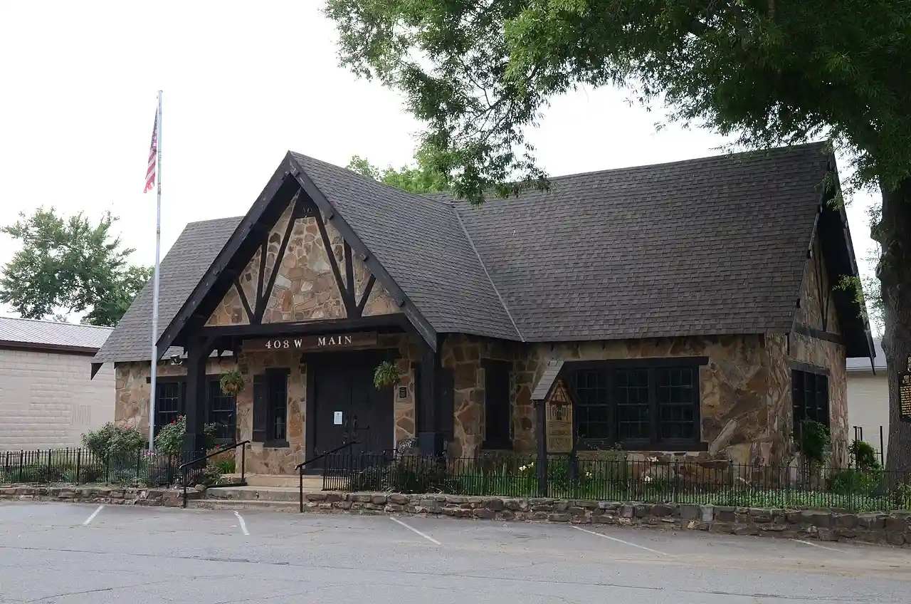 The Perryville American Legion Building is a historic fraternal meeting hall at Plum and Main Streets in Perryville, Arkansas. It is a single story masonry building with Rustic and Tudor styling. It has a steeply pitched gable roof, with a projecting gabled entry vestibule facing the street. The gable ends are decorated with half-timbering, and the roof eaves show exposed rafter ends in the Craftsman style. The hall was built in 1935 by the Civilian Conservation Corps, and is the community's best example of the Rustic style. Read more on Wikipedia