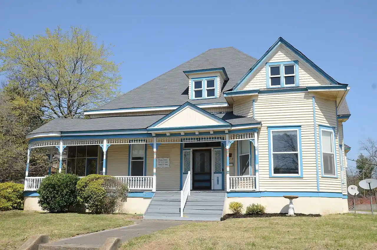 The Coolidge House is a historic house at 820 Perry Street in Helena, Arkansas. It is a -story wood-frame structure, built in 1880 by S. C. Moore as a wedding present for his daughter, Anna Leslie Moore, and Charles Coolidge, Jr. It is an excellent local example of Queen Anne styling, with numerous gables projecting from its steeply hipped and busy roof line. The porch extends partly across the front (south) before wrapping around to the west; it has sawn brackets and a spindled frieze, with a pedimented gable above the stairs. Read more on Wikipedia