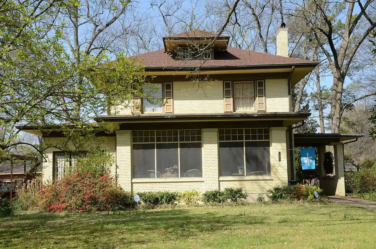The Gemmill-Faust House is a historic house at 321 St. Andrew's Terrace in West Helena, Arkansas. It is a two-story wood-frame structure with a brick-face exterior, built c. 1920. The house is an excellent local example of the Prairie School of design, with its broad spreading eaves, hip roof with hipped dormer, light-colored brick, and ribbon windows throughout. A period garage stands west of (behind) the main house. Read more on Wikipedia