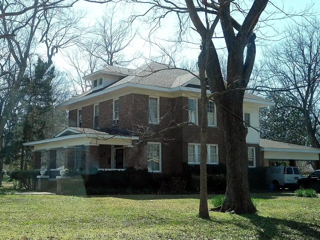 The Myers House is a historic house at 221 St. Andrew's Terrace in West Helena, Arkansas. It is a two-story wood frame and brick house with a hip roof pierced on three sides by broad hip-roof dormers. Built c. 1920, it represents an excellent local synthesis of Craftsman and Prairie School styling. Read more on Wikipedia