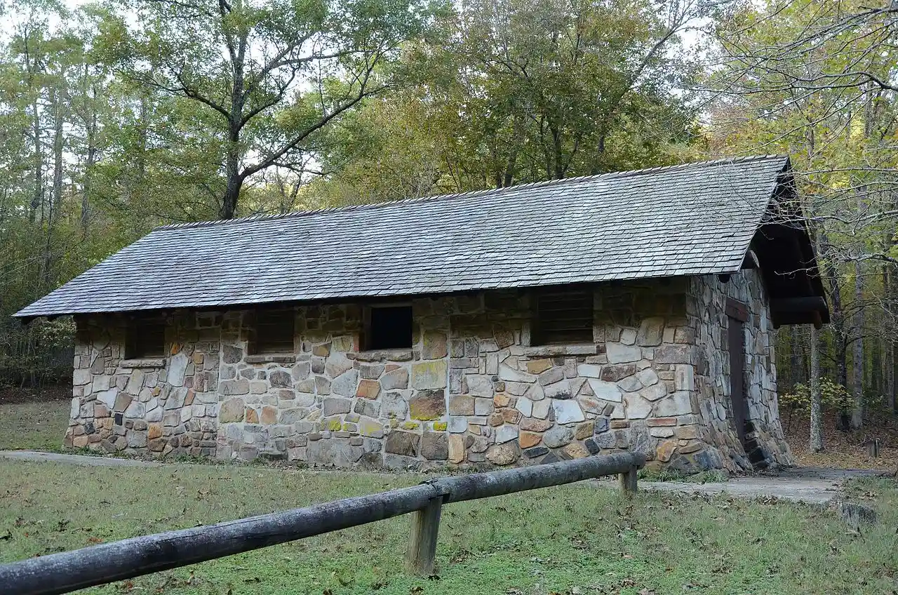 The Bard Springs Bathhouse is a historic recreational support facility in Ouachita National Forest. It is located at the Bard Springs recreation site, southeast of Mena and north of Athens in Polk County, off County Road 82 and Forest Road 106 on the banks of Blaylock Creek. It is a single story rustic stone structure, with entrances at either end into open areas for changing. The interior is lit by skylights in the roof. It was built in 1936 by a crew of the Civilian Conservation Corps, and is one of four surviving CCC structures (the others are two dams and a picnic shelter) in the immediate area. Read more on Wikipedia