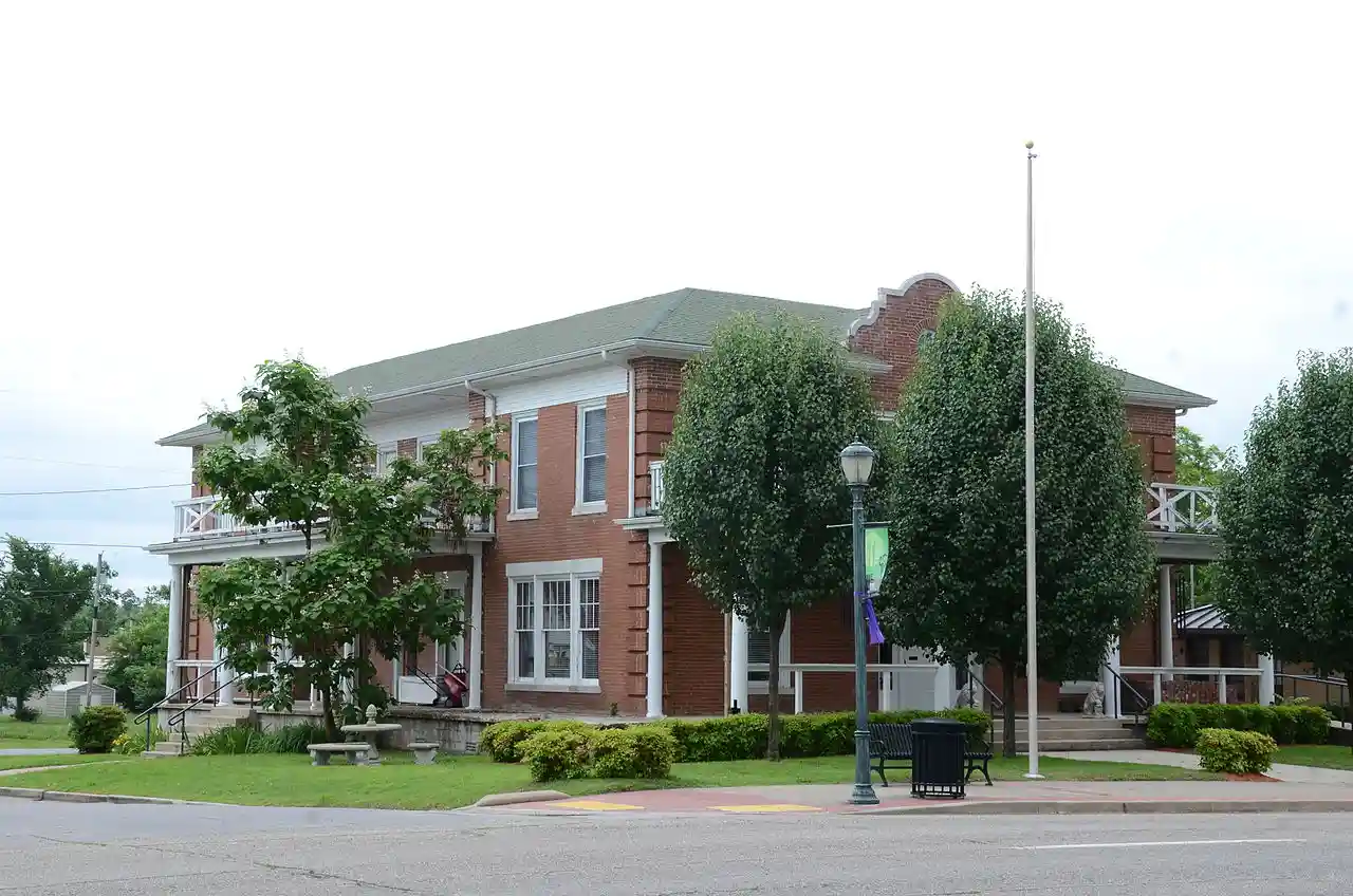 The Elks Lodge is a historic clubhouse at 500 Mena Street in Mena, Arkansas. It is a two-story brick building, with a hip roof, marble trim, and a granite foundation. Its Colonial Revival styling includes corner quoining, porches along the front and side with square supporting posts and diamond-pattern balcony balustrade above. It was built in 1908 by the local chapter of the Elks fraternal organization, and has long been a local social venue. Between 1935 and 1951 it housed the local hospital, after which it returned to the Elks. It is also one of the community's finest examples of commercial Colonial Revival architecture. Read more on Wikipedia