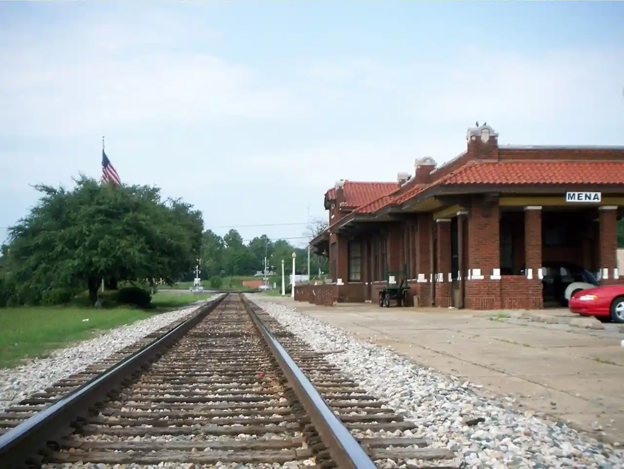 The Mena Kansas City-Southern Depot is a historic railroad station on Sherwood Street in the center of Mena, Arkansas. It is long single-story structure, built out of brick, with a tile roof and Mediterranean styling. It was built in 1920 by the Kansas City Southern Railway to designs by the company architect, T. C. Horstmann, and is one of the most elaborate surviving early-20th century railroad stations in the state. It is now owned by the city, and houses a local history museum and the local chamber of commerce. Read more on Wikipedia