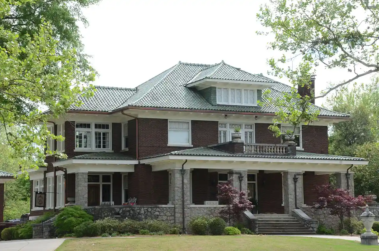 The John W. White House is a historic house at 1509 West Main Street in Russellville, Arkansas. It is a broad two-story brick structure, in a broad expression of the American Foursquare style with Prairie School and Craftsman elements. It is covered by a hipped tile roof, with a hipped dormer on the front roof face. A single-story hip-roof porch extends across the front, supported by rustic stone piers and balustrade. The house was built in 1916 for a wealthy banker and businessman, and is one of the finest high-style houses in the city. Read more on Wikipedia