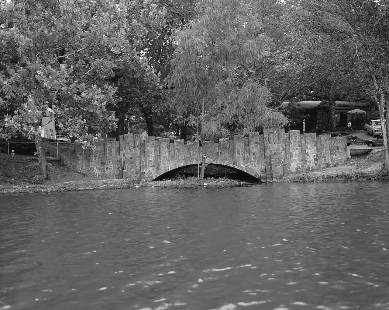 The Edgemere Street Bridge is a historic bridge in North Little Rock, Arkansas. It carries Edgemere Street over a small part of Lakewood Lake Number Three. It is a masonry structure with closed spandrels, and has a span of about and a total length of . It is built out of rustic, roughly squared fieldstone, that is laid in uncoursed fashion. Vertical columns project from either side of the spandrels, rising above the deck level to form a decorative parapet. It was built, along with the similar Lakeshore Drive Bridge as part of the innovative Lakewood Development project of developer Justin Matthews in the 1930s. Read more on Wikipedia