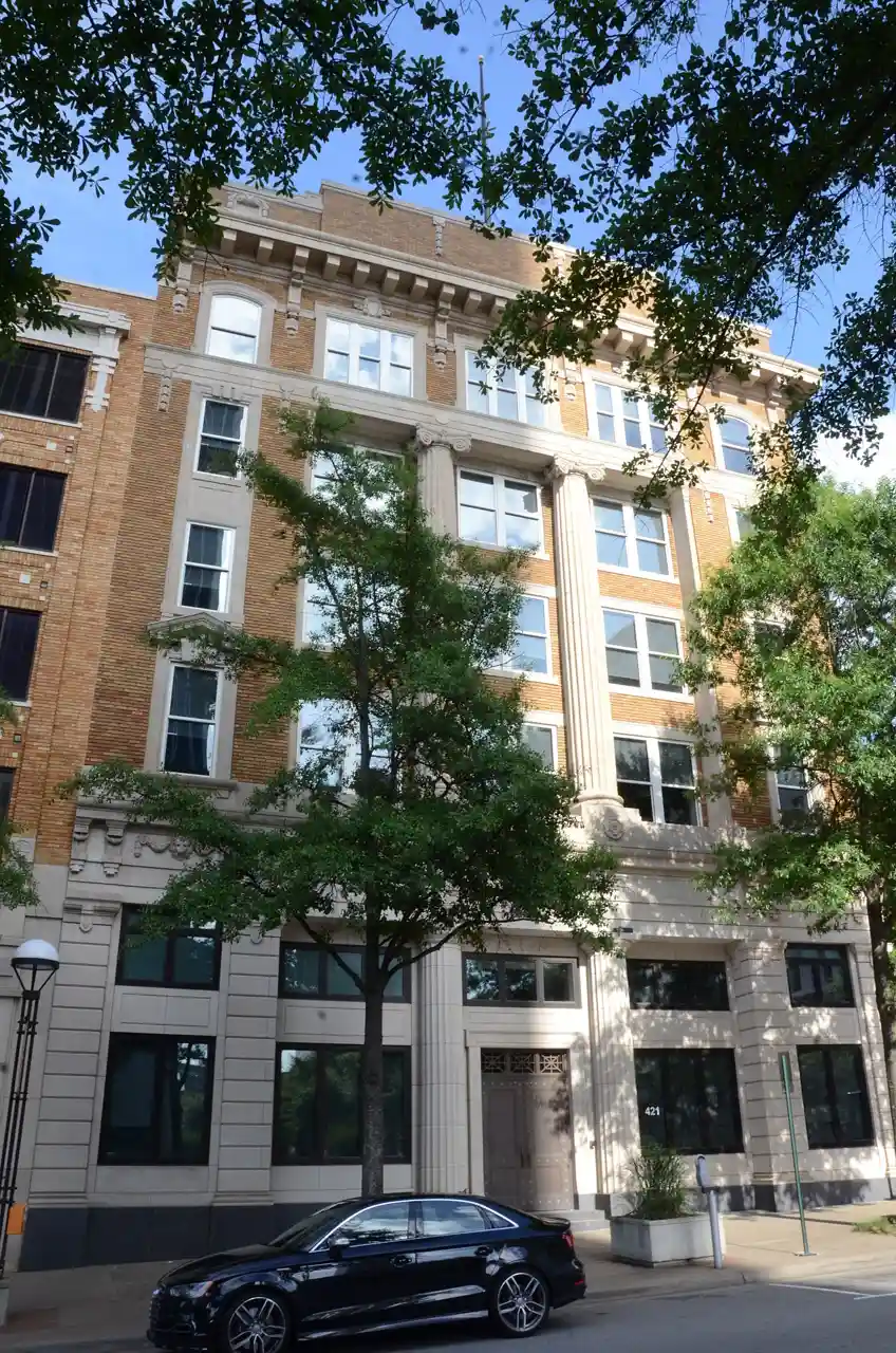 The Exchange Bank Building is a historic commercial building at 423 Main Street in Little Rock, Arkansas. It is a five-story masonry structure, built in 1921 out of reinforced concrete, brick, limestone, and granite. It has Classical Revival, with its main facade dominated by massive engaged fluted Doric columns. It was designed by the noted Arkansas architectural firm of Thompson & Harding, and is considered one of its best commercial designs. Read more on Wikipedia