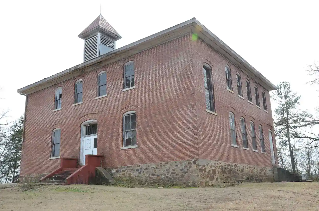 The Bates School is a historic former school building at 1074 Bates School Road in Bates, Arkansas. It is a two-story brick building with a hip roof and Colonial Revival styling. Its main facade has a central entrance in a recessed segmented-arch opening, which is flanked on either side by windows set in similar openings. At the second level there are four windows two directly above the lower flanking windows, and two above the entrance. A cupola is set near the base of the roof above the entrance; it is square, louvered on all sides, and topped by a pyramidal roof. The school was built in about 1916, and was in use serving as a public school until 1964. Read more on Wikipedia